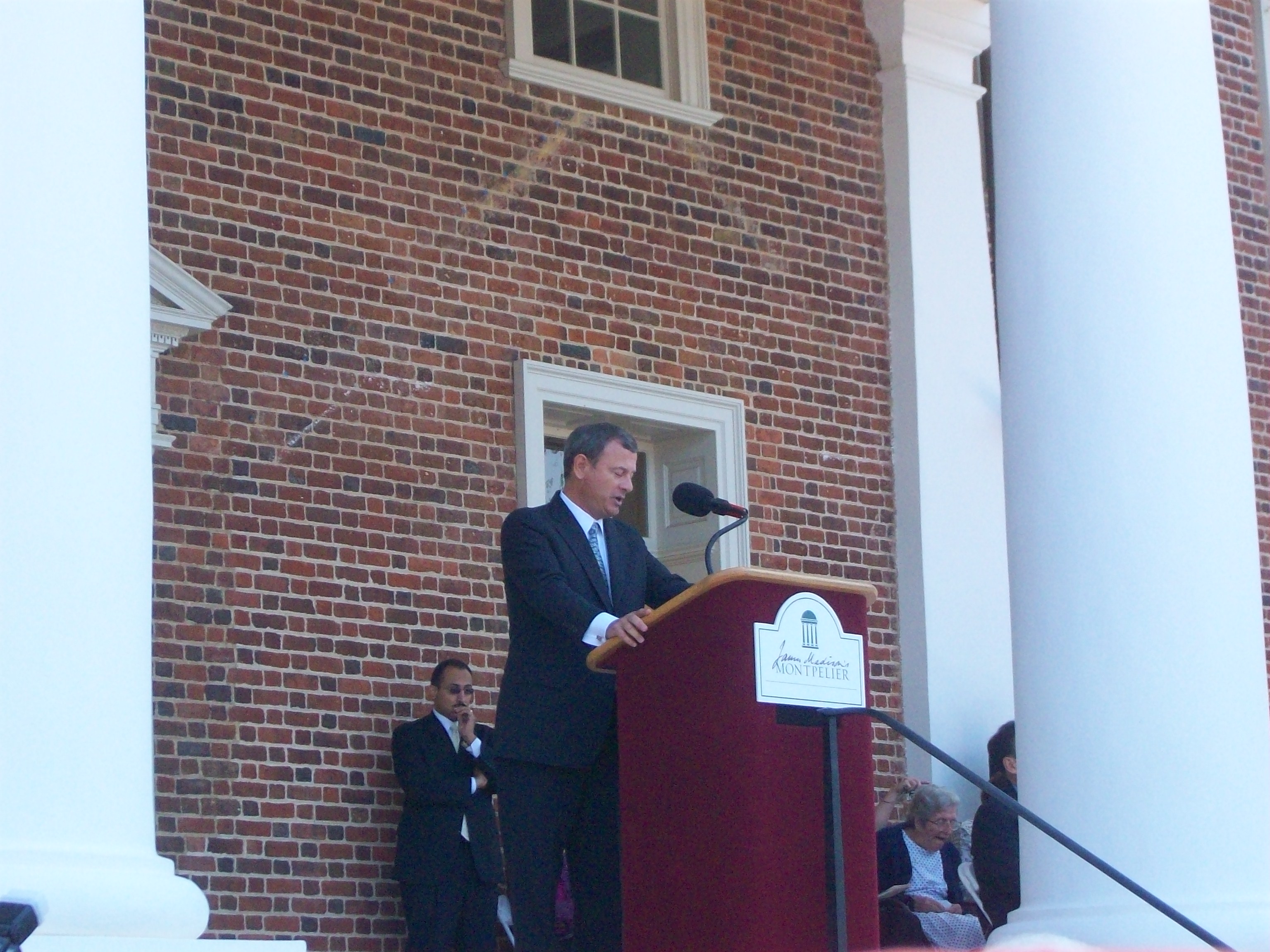Chief Justice John Roberts (left) was the keynote speaker on Constitution Day at James Madison’s Montpelier in Orange, Virginia. Under a beautiful late summer sky, several thousand people came together this morning on the front lawn to hear of Madison – the Father of the Constitution and one of the most under-appreciated Founding Fathers – and to celebrate the completion of the restoration of his home, Montpelier. It was a wonderful day that, as National Trust for Historic Preservation President Richard Moe said, doesn’t get any better if you’re in this business.