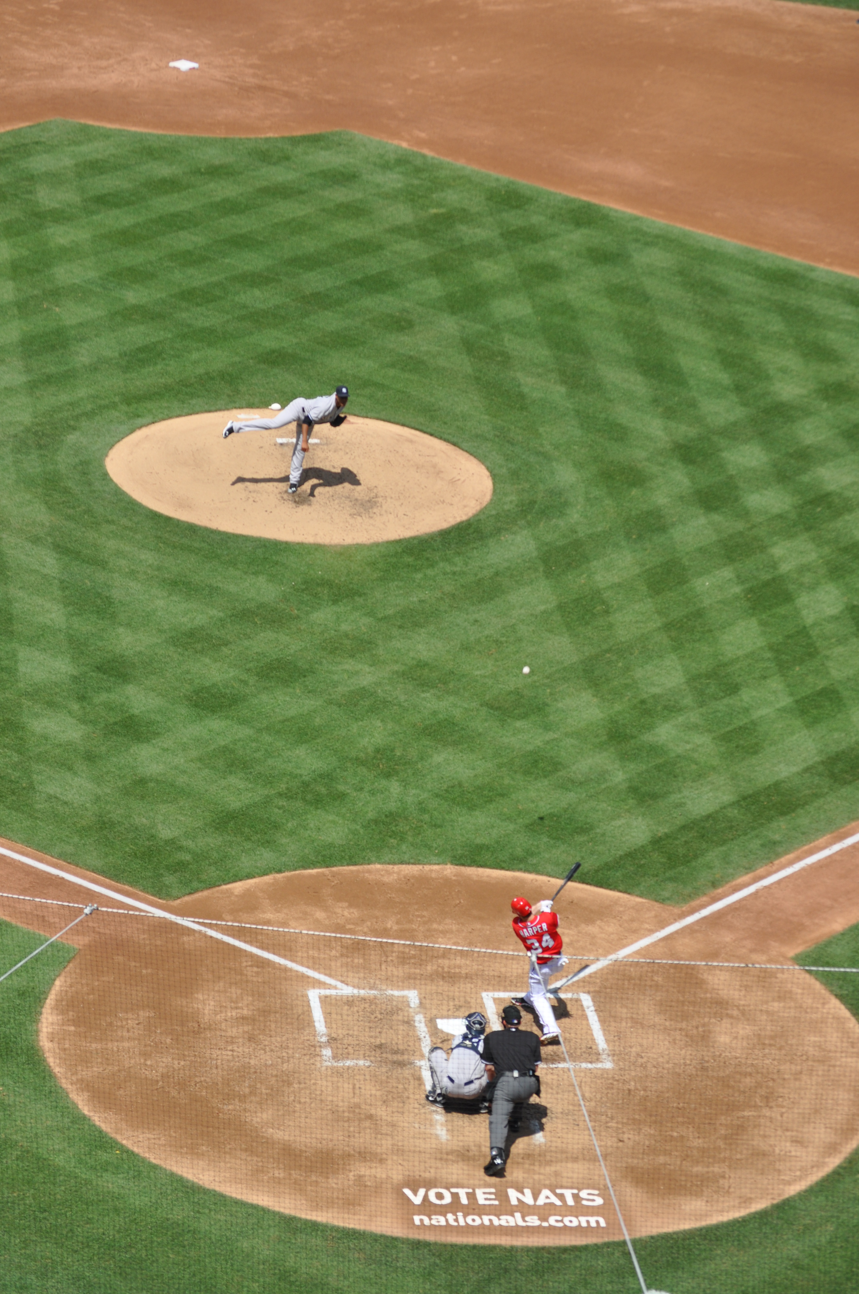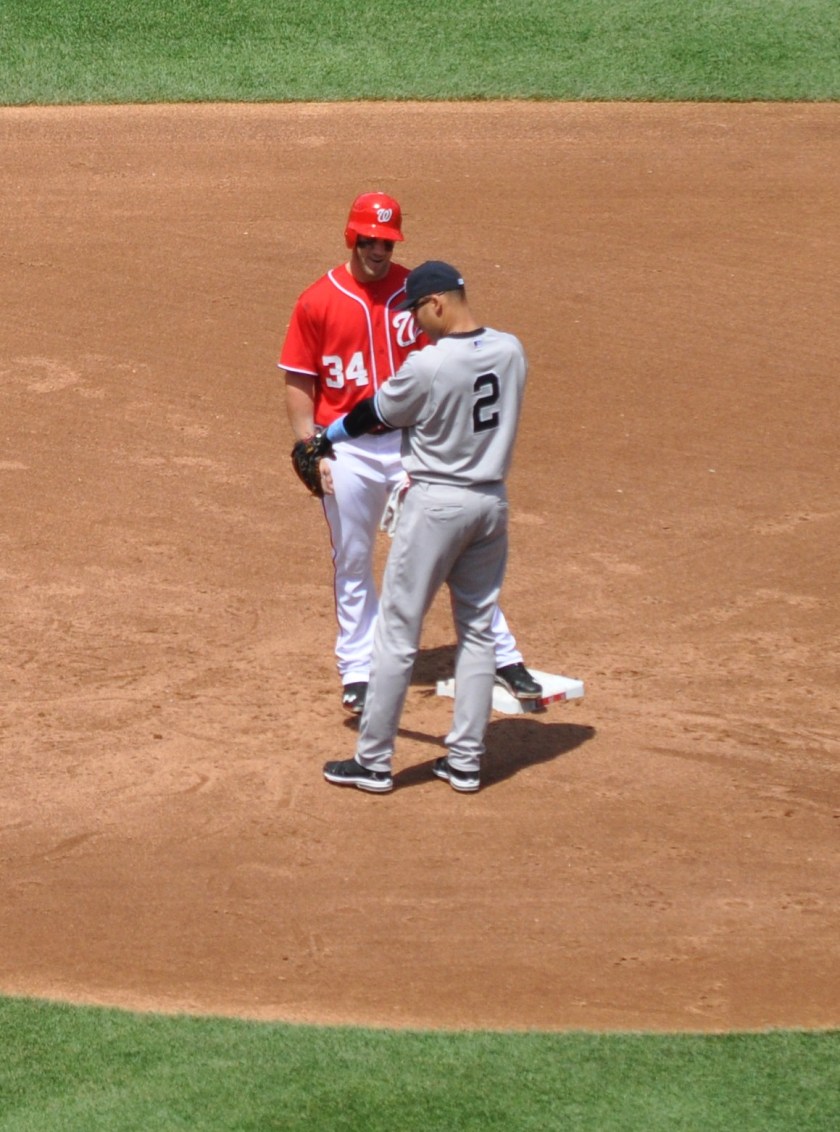 …and then spend the next minute or so chatting with first-ballot Hall-of-Famer Derek Jeter on second base. I don’t know if they had met before (Harper was 0-7 in yesterday’s 14-inning marathon, so I know Harper and Jeter didn’t run into each other on the base paths in that game). The body language of the two seemed to indicate that they were taking advantage of the moment to introduce themselves. A friendly pat on the rump from Harper as Jeter headed back to short and Jeter’s returning the gesture with a small wave of his glove led me to believe that the respect was flowing both ways.