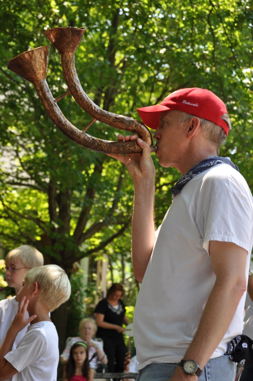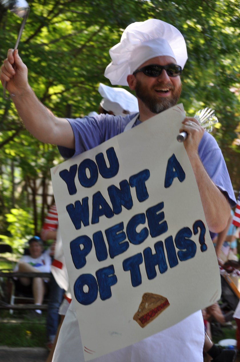 Outfitted with their aprons, beaters, and spatulas, they marched along with the local organic food market, holding signs that asked, “You want a piece of this?” Candice, Claire, and I – who took the short Metro ride to Takoma Park and claimed our traditional shady spot on Maple Street – all laughed at the silliness.