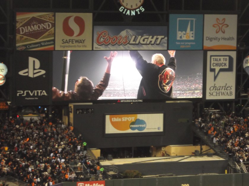 As could only happen in San Francisco, the Giants were handing out Jerry Garcia bobbleheads (for a hefty price) in honor of Jerry Garcia day on what would have been the 70th birthday of the Grateful Dead’s guitarist. Band mate Bob Weir sang a beautiful national anthem with the Giants third base coach Tim Flannery. (A singing coach was a first for me!) At the seventh inning stretch, Dead drummer Mickey Hart and Deadhead Bill Walton led the crowd in Take Me Out to the Ballgame (see photo of them waving to the crowd above). All in all you knew you had left St. Louis and could only be in San Francisco.