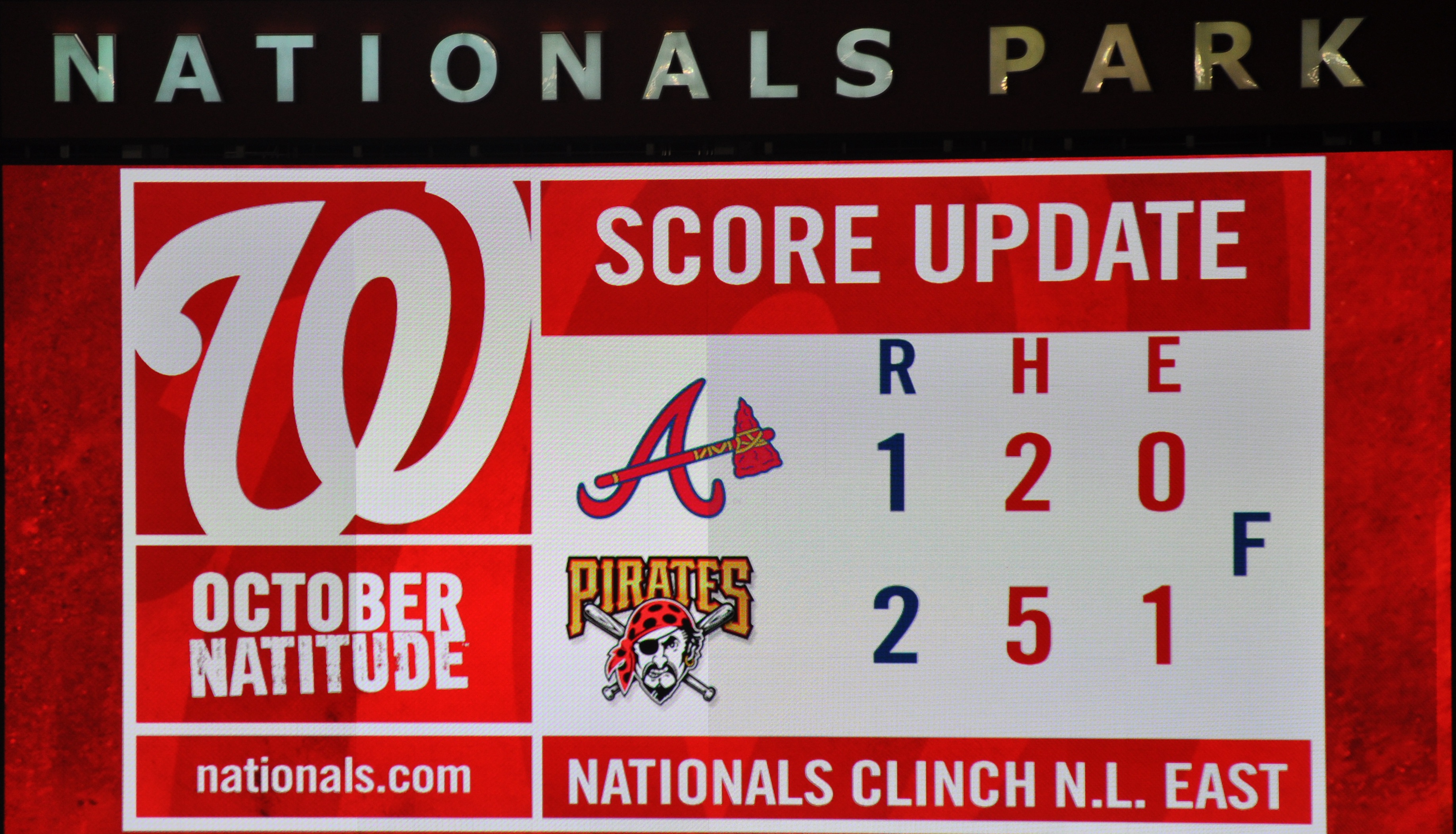 It didn’t happen the way we hoped, with a Nats victory. But since they played so well from April through September, this loss on the first day of October didn’t keep our boys from clinching. About 10 minutes before our game ended, the Pittsburgh Pirates (bless their hearts) defeated the Atlanta Braves. With a magic number of one, the deed was done and the outcome on the field was anti-climatic.