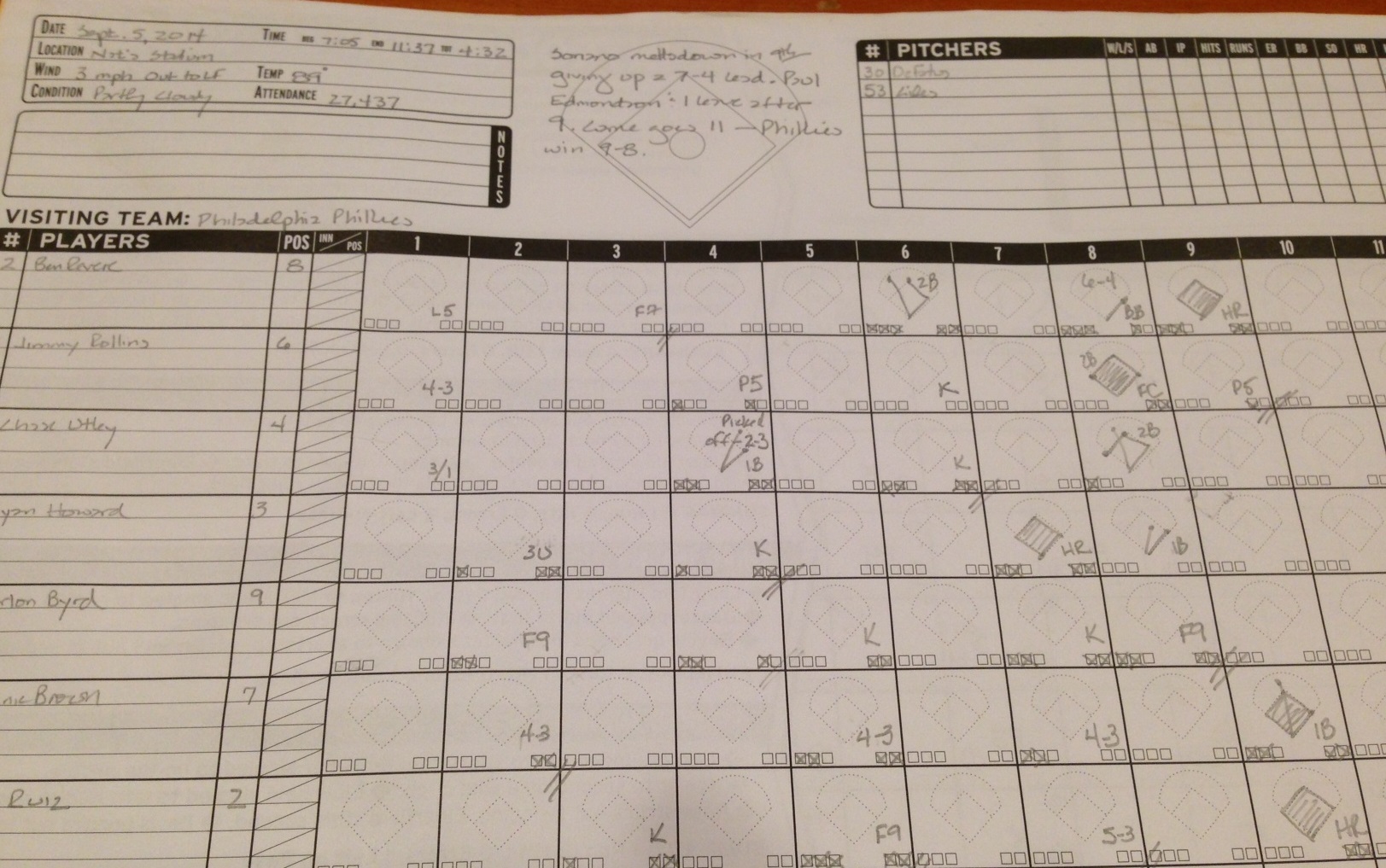 He did better. It wasn’t a complete meltdown, but it was also pretty lack-luster, especially against a team as bad as the Phillies have been this year. If you want to play in the postseason, my score book would have to play like he wanted to be there. At the end of the evening, the Nats had dropped a 3-1 game. Once again, my score book captured it all.