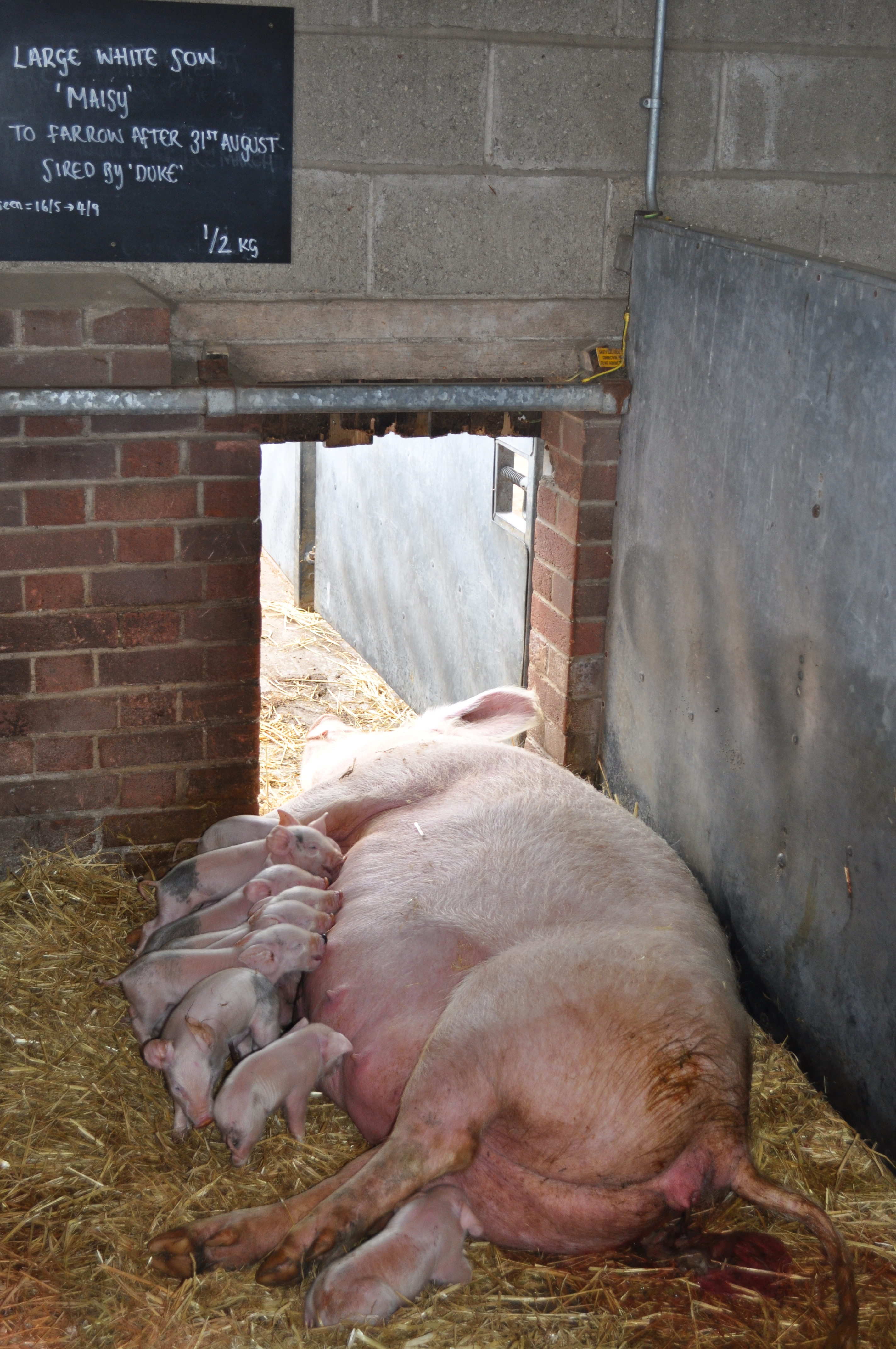 We next moved into the piggery, where one sow had just delivered a litter of nine piglets.