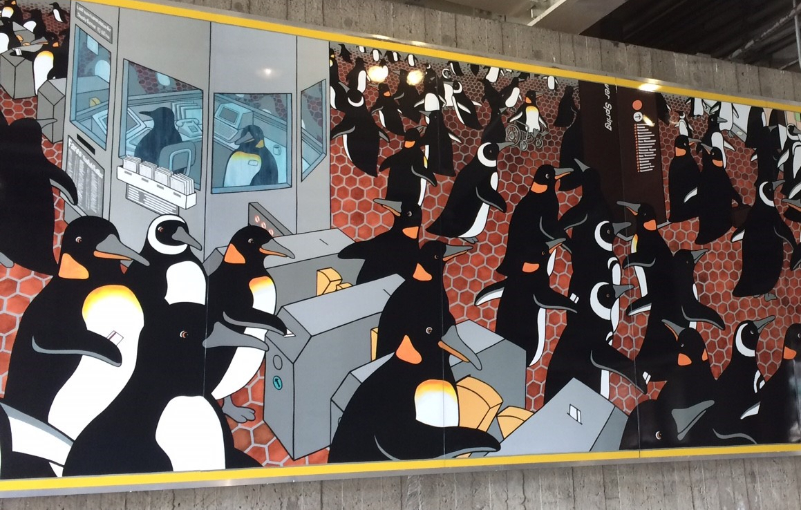 Living across the street from the Metro station, I encounter people heading to their labors. Prior to the pandemic, many would be dressed alike in the professional Washington uniform — which is key context in making the 100-foot-long Penguin Rush Hour mural at the station so deliciously delightful.