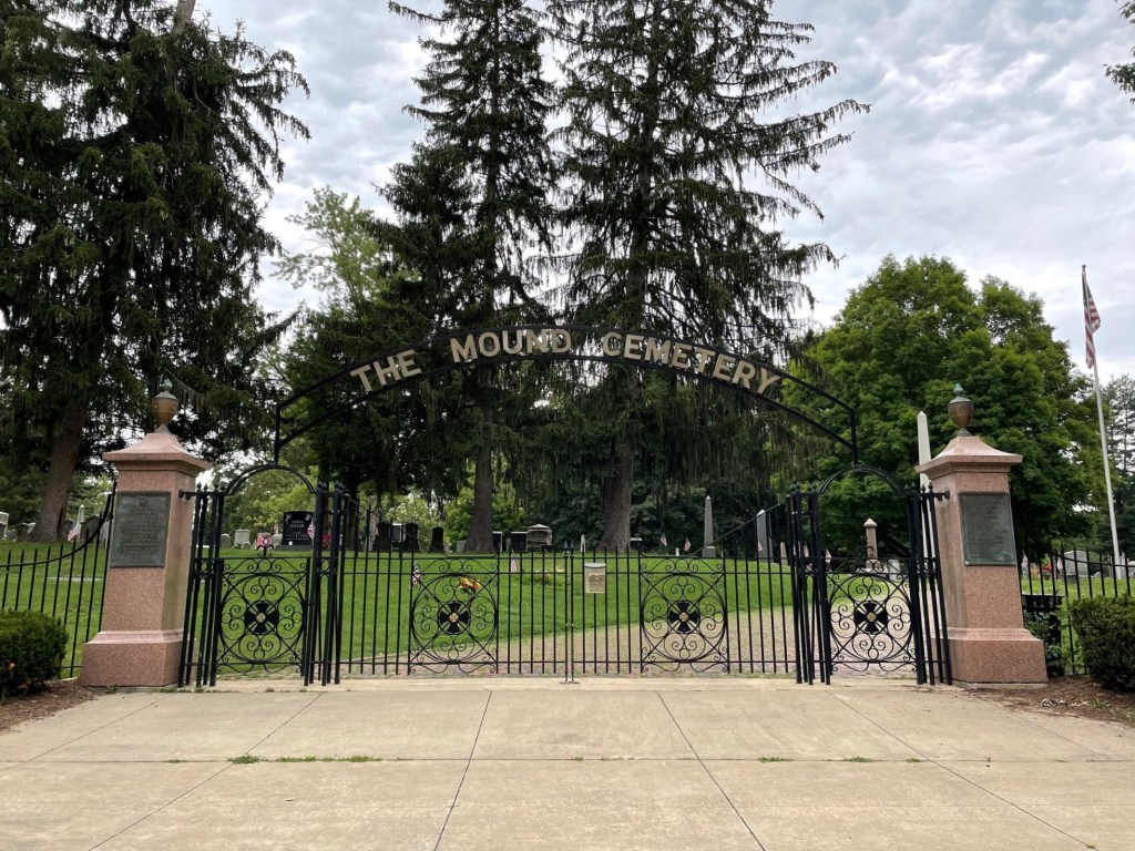 In Marietta, Ohio, we visited The Mound Cemetery — also listed on the National Register of Historic Places. At the center stands a 2,000-year-old burial mound of the Adena culture, surrounded by graves where it is believed more Revolutionary War officers are buried than at any other cemetery in the country. Marietta was part of a land grant given to soldiers in lieu of pay by the new nation, explaining how so many ended up in this beautiful Ohio-river community.