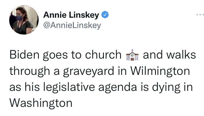 It was a Sunday. Biden goes to church on Sunday. The hometown church he attends has a cemetery, where his first wife and two children are buried. Any thoughtful White House reporter — who operated from a place of empathy and understanding — would realize that fact. They would also know that legislation gets negotiated — endlessly — before it is enacted. Just because a Republican party that isn’t interested in governing would like us to believe that the Democrats are in disarray, doesn’t mean that good political reporters have to repeat Mitch McConnell’s self-serving talking points.
