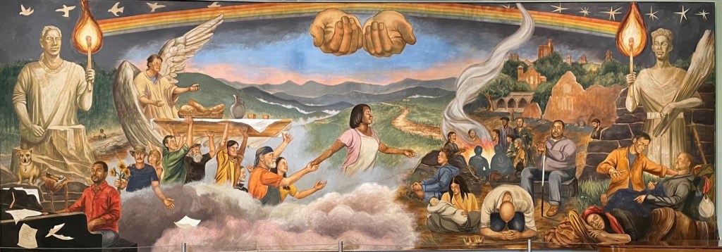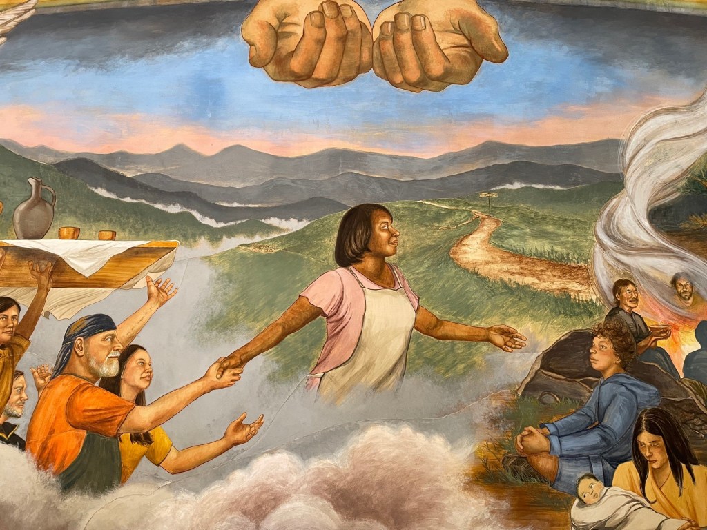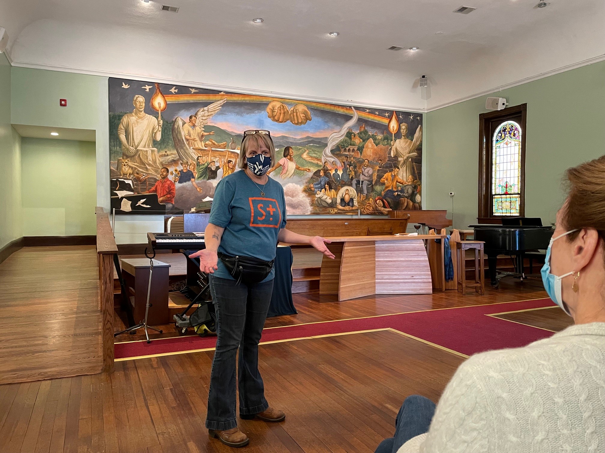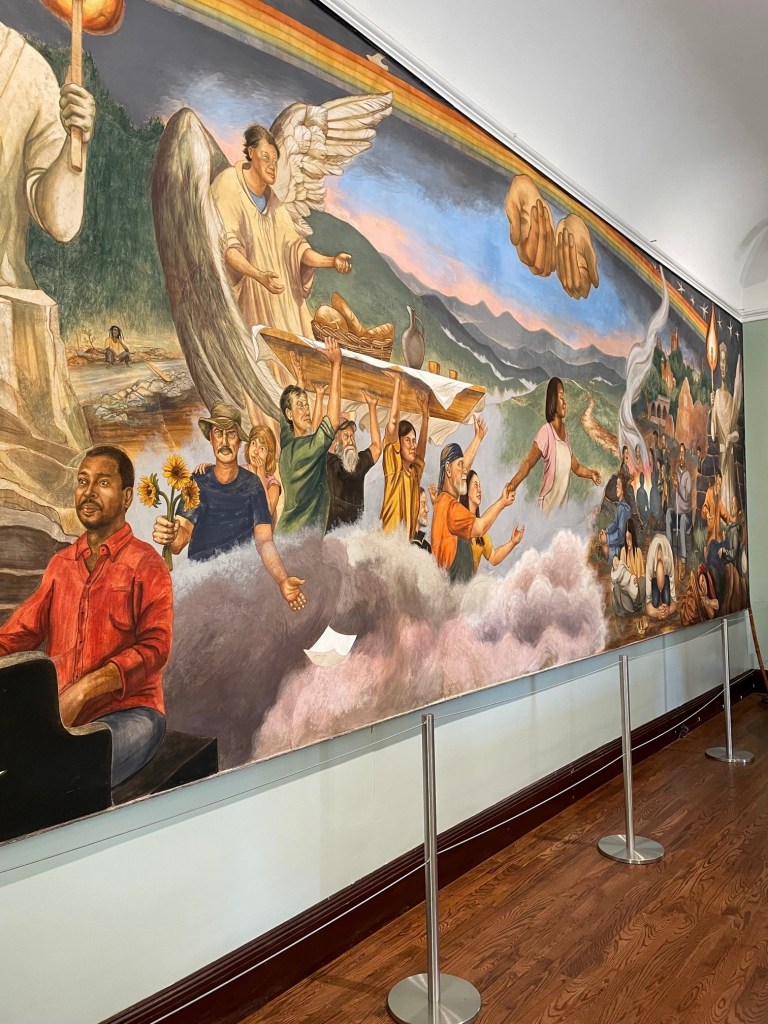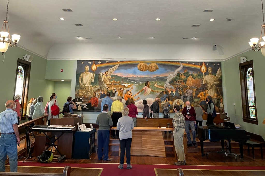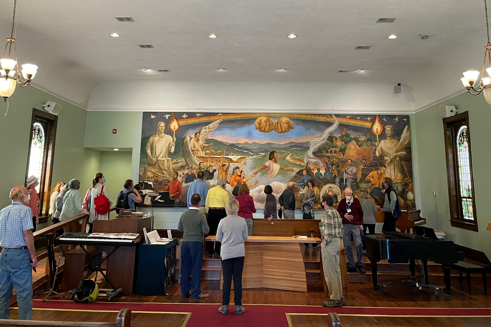 Our National Trust Tour travelers had come to this place to see one of the newest additions to the Appalachian murals: the Haywood Street Fresco. The second clue that our expectations were about to be challenged was the mission statement for the fresco, displayed on a large wall painting just inside the front door of the Haywood Street Congregation.*
