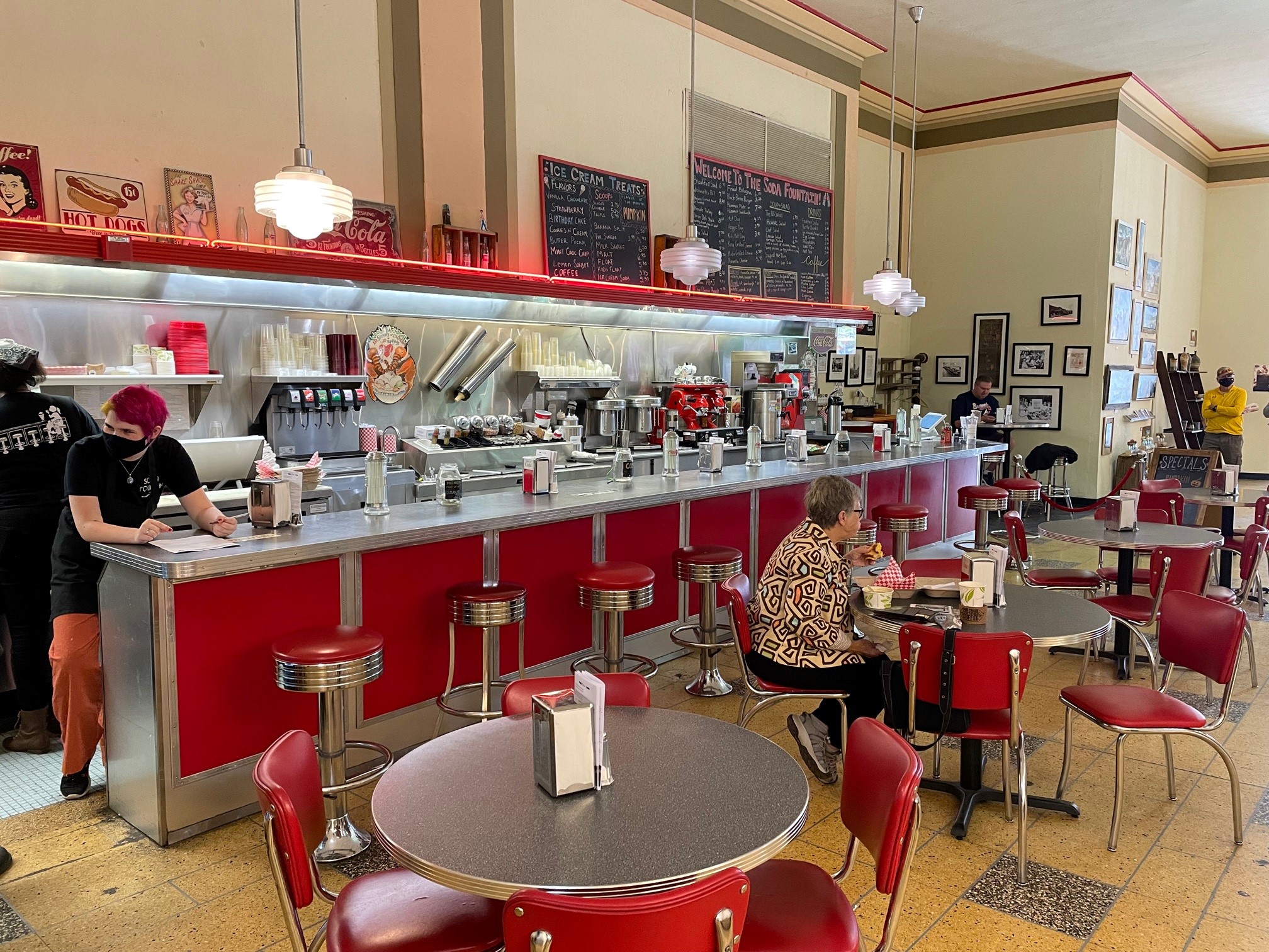 Historic soda fountain in the repurposed Woolworth’s Building, now a thriving arts center