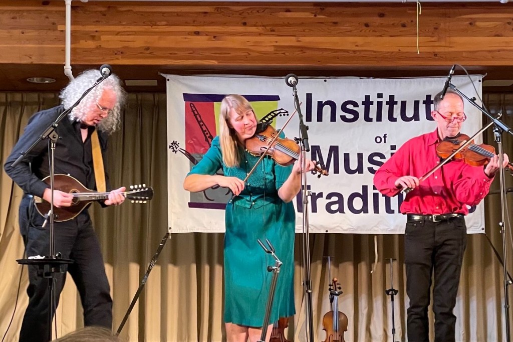 Robin Bullock, Elke Baker, and Ken Kolodner (l to r) at the 2021 IMT Celtic Christmas concert with Robin’s 100-year-old A-style mandolin.