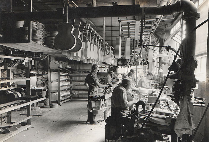 Gibson factory: This is the interior of the factory that was in use in 1920, although this photo is from 1936 (credit: Kalamazoo Public Library)