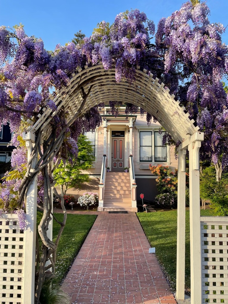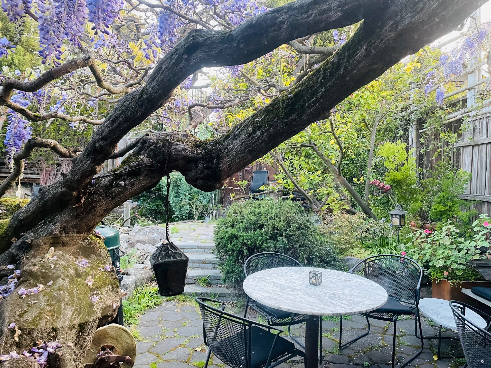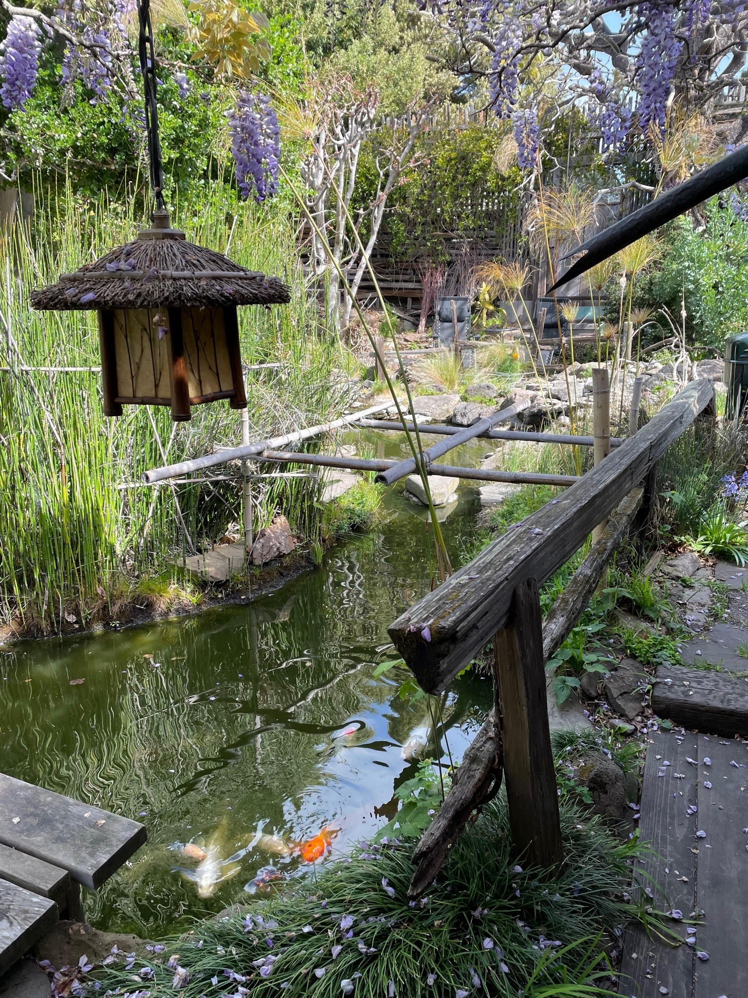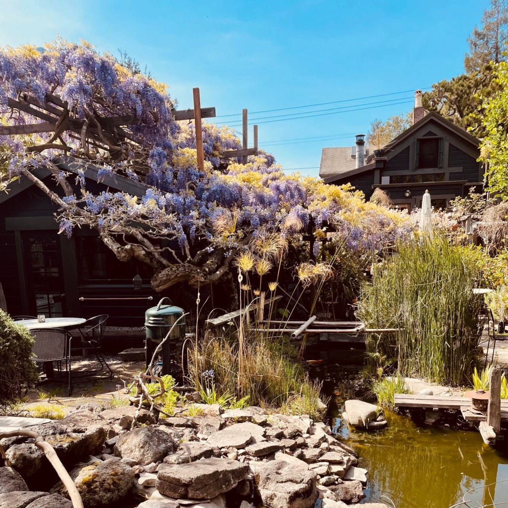First, let me say that it is a wonder that I ever left the luscious and welcoming garden lovingly tended by our Vrbo hosts, Arthur and John, for the past 50 years. I did spend many an hour sitting beneath the wisteria, listening to the songs of the canaries, taking in the scents of a wealth of plants flourishing in the California spring, watching a hummingbird take care of her children in her tiny nest, and being mesmerized by the sounds of the water. Heavenly.