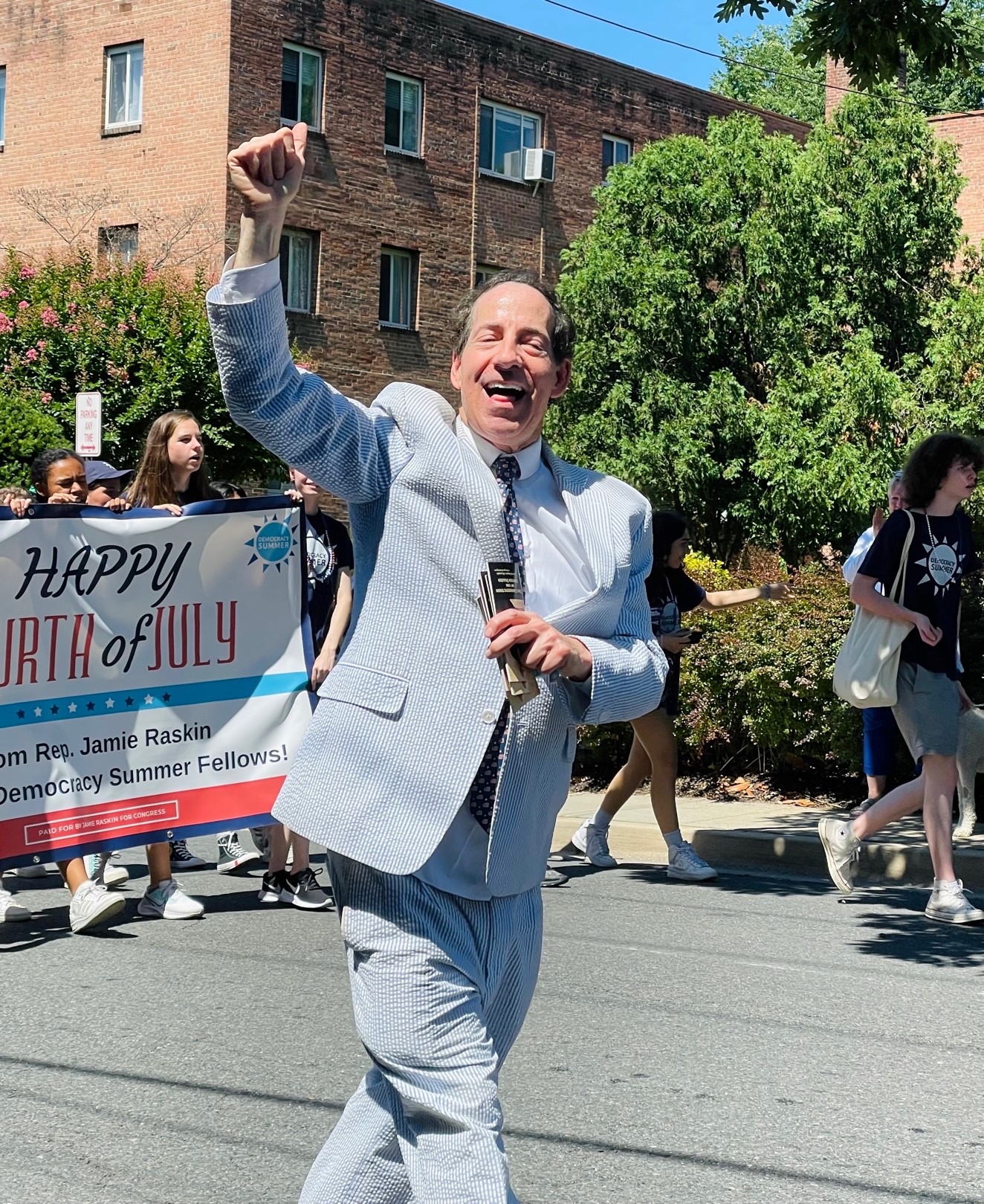 Image: Congressman Jamie Raskin marches with the Democracy Summer Fellows at the Takoma Park July 4th parade (photo by DJB).