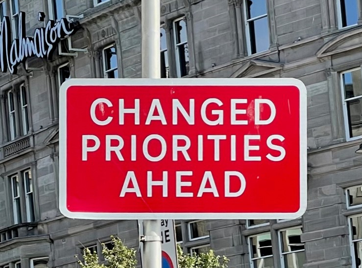 I finally Googled “Changed Priorities Ahead” and it simply means there’s a new traffic pattern. I prefer to keep thinking of it as a sign from the universe.