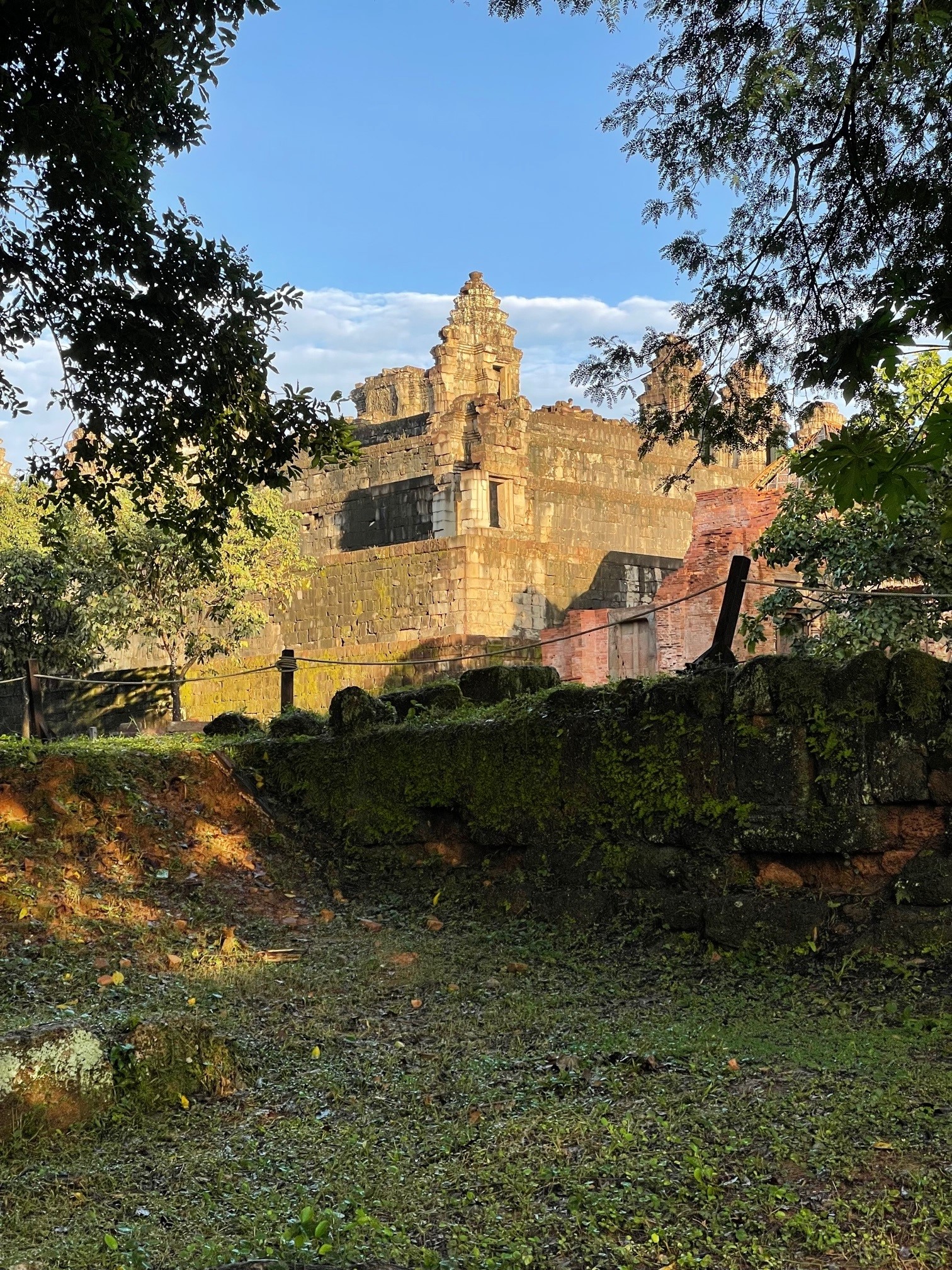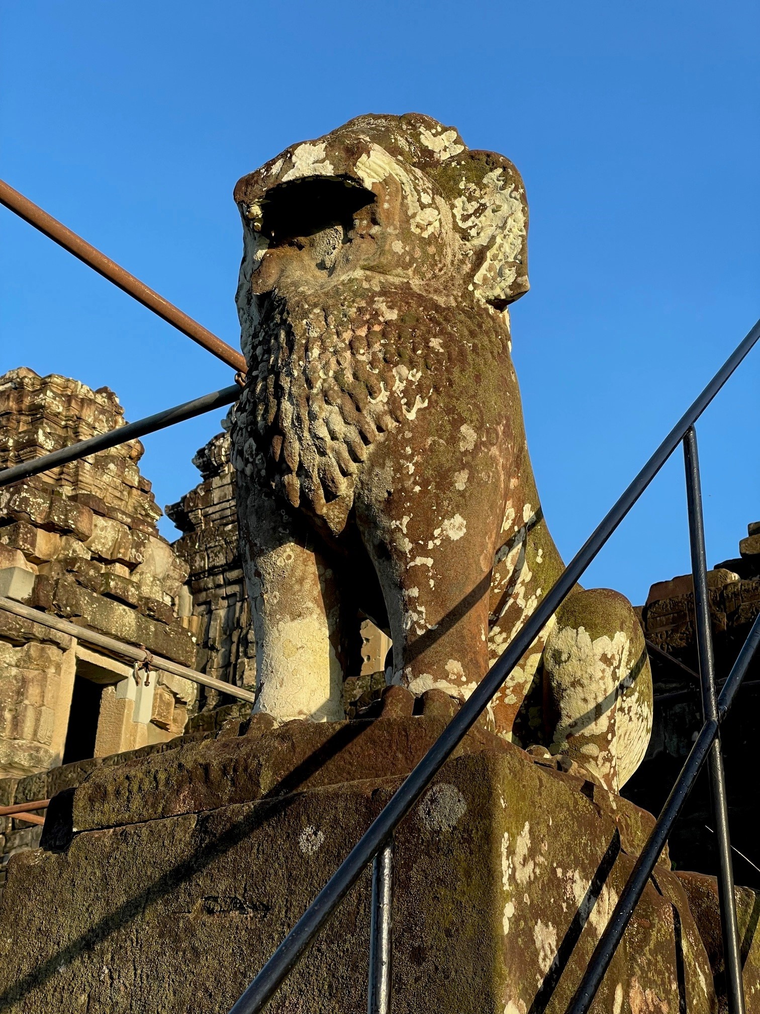 Phnom Bakheng, the state temple of the first Khmer capital in the Angkor region, survives as one of the world’s greatest architectural treasures. The Temple of Phnom Bakheng was constructed between the late ninth and the early tenth century by Yasovarman I as the centerpiece of his new capital, known as Yasodharapura. It was abandoned only a few decades after its construction, but its privileged hilltop location makes it unique among the temples of Angkor. Its stepped pyramid construction is a built representation of Mount Meru, the center of the physical and metaphysical universes in dharmic religions. Shrines and guardian lions adorn the seven levels of terraces that make up the pyramid; decreasing in size towards the top of the temple, these enhance the impression of the temple’s height. Five shrines on the top platform, arranged in a quincunx formation, represent the five peaks of Mount Meru. In the sixteenth century, an attempt was made to construct a large seated Buddha around the central shrine, which has since been dismantled. The central temple was surrounded by multiple brick towers, which only survive as ruins. Today, Phnom Bakheng is a popular spot for panoramic views of the Angkorean landscape, often enjoyed by visitors at sunset.