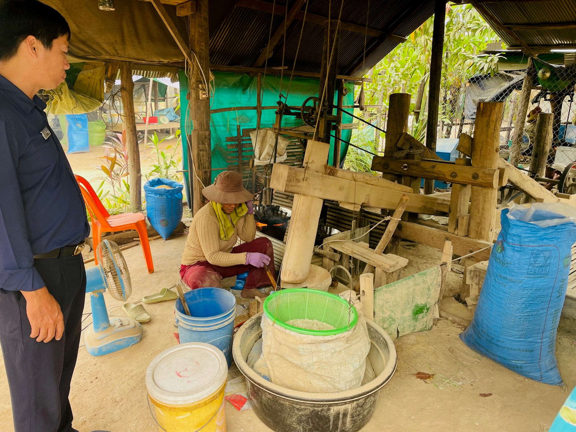 Flattening rice using traditional tools (but with an electric generator to supply the energy for the pounding mechanism)