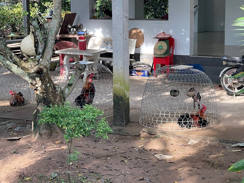 Some traditional scenes — such as the pens for these roosters, kept separated to help train them for cock fighting — challenged our sensibilities