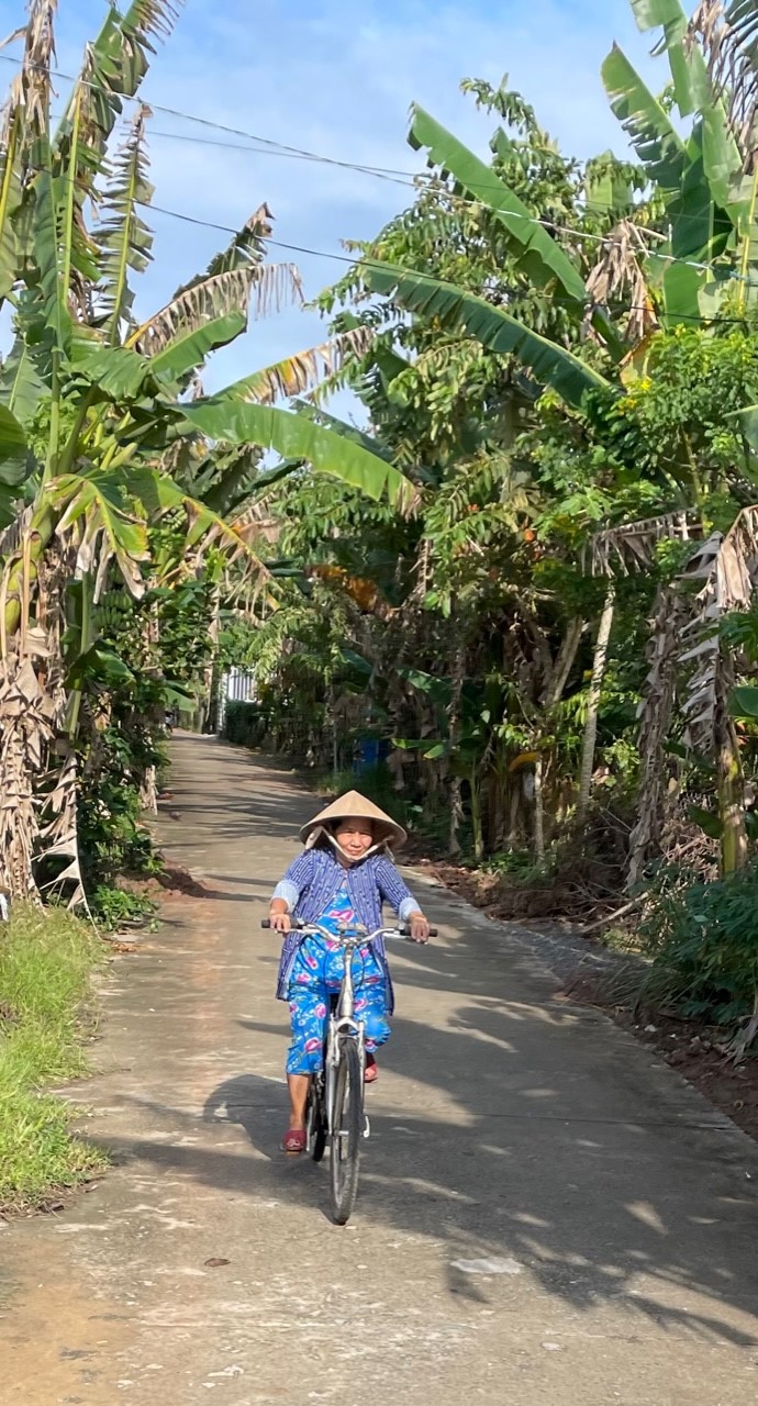This Vietnamese woman riding a bicycle on one of the island roads along the river was something of an anomaly.