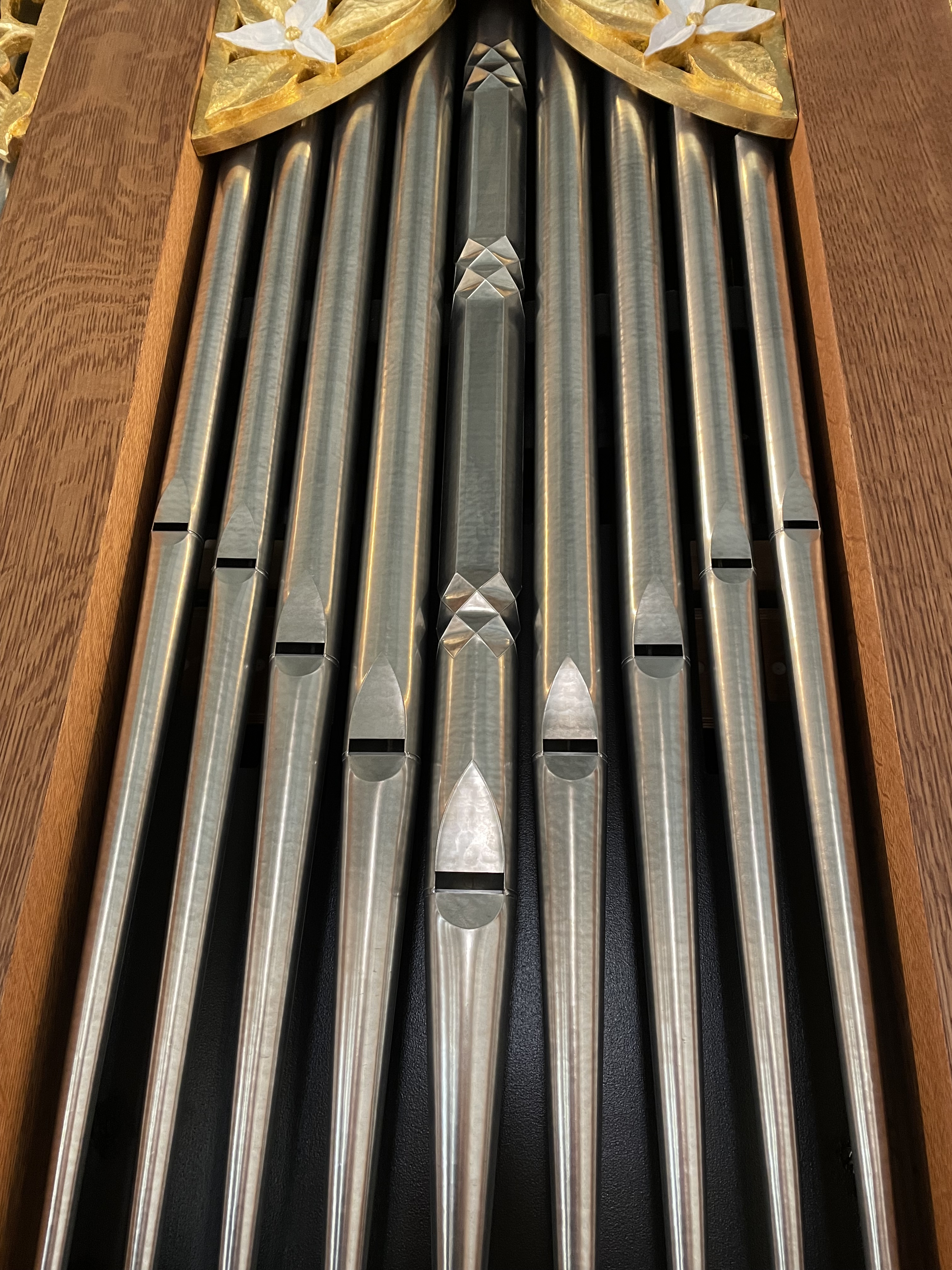 *Our dear friend Kate Harrington, daughter of long-time friends Constance and Jim Harrington of Staunton, was one of the pipe builders on the Fisk organ. Her handicraft can be seen in the pictures above.