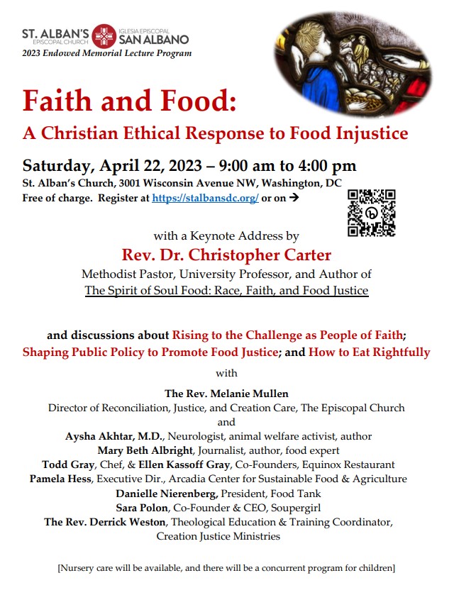 Earth Day 2023 is an especially appropriate time to consider that question with a discussion around ethical responses to food injustice. St. Alban’s Episcopal Church in Washington, DC will be hosting Methodist pastor and theologian the Rev. Dr. Christopher Carter who will keynote a daylong examination of Faith and Food: A Christian Ethical Response to Food Injustice on Saturday, April 22nd.