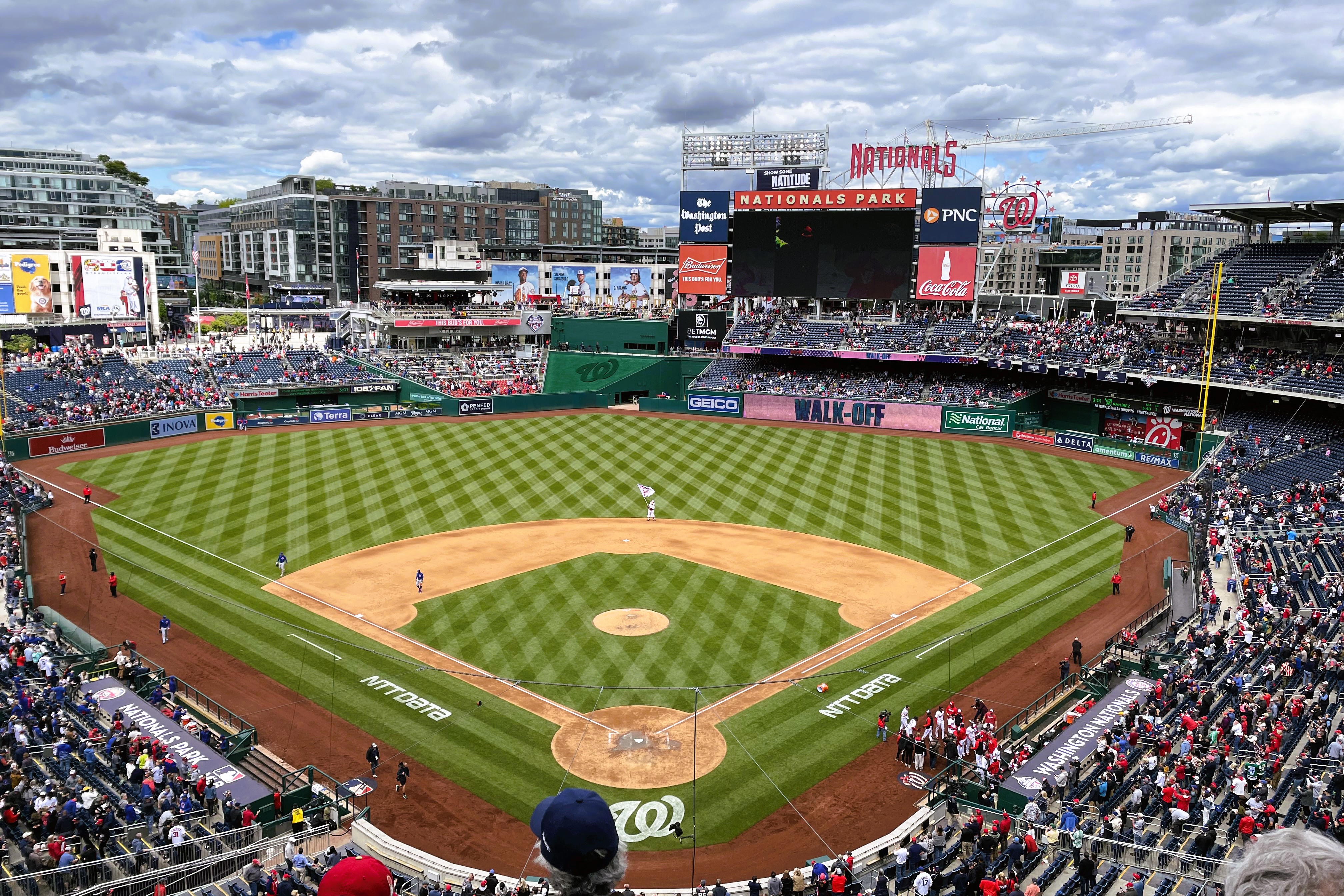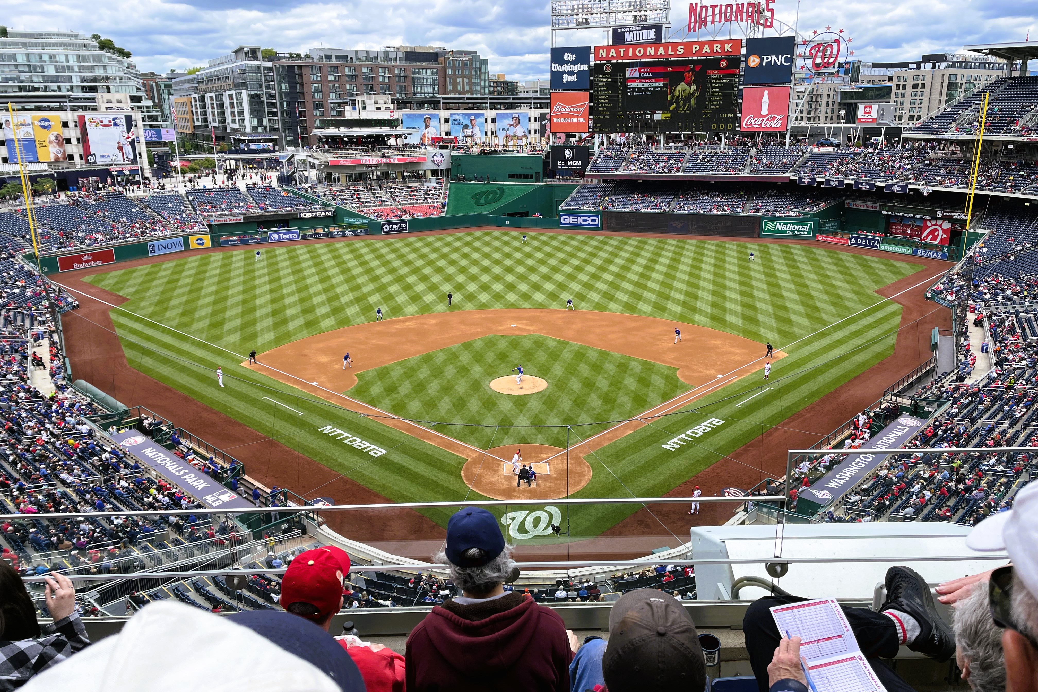 Then yesterday was the first game in my reduced six-game package for the Washington Nationals. For reasons mentioned elsewhere, our group took out a half-season plan for 2023. In response, the Nats shifted our seats a bit and, lo-and-behold, they are actually better. We’re now right behind home plate. Our new seats are literally two rows below the television camera at the press-box level that shows the full field action.