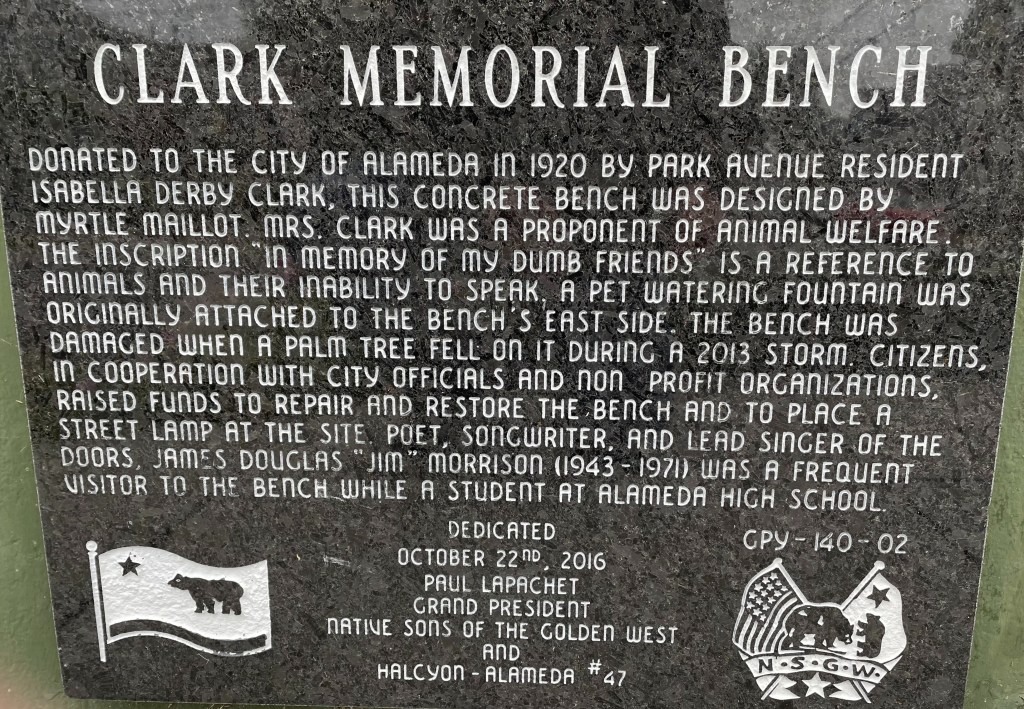 - Jim Morrison, the lead singer of the 60s rock band The Doors, was a frequent visitor to the Clark Memorial Bench while a student at Alameda High School in Alameda, California.