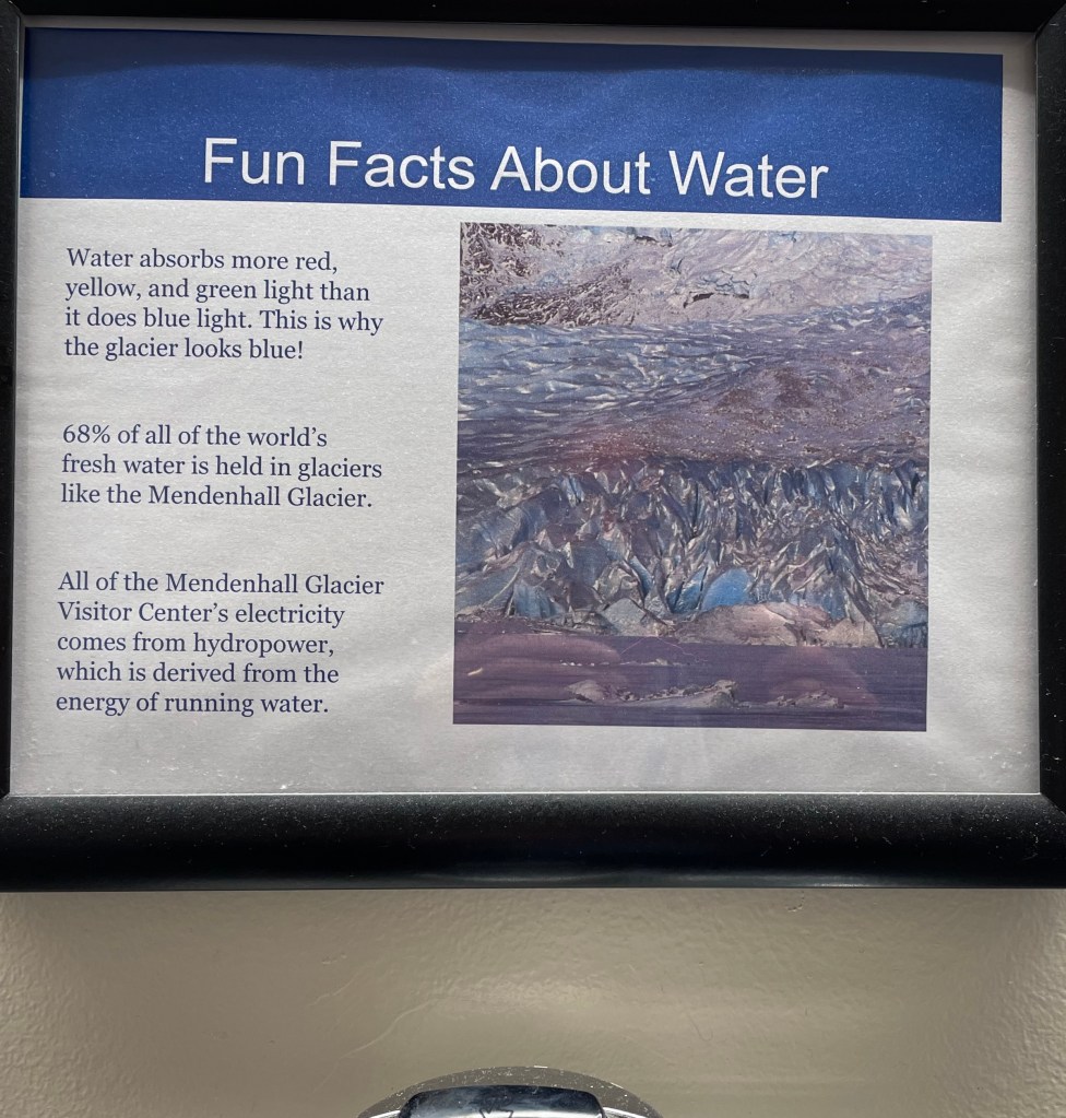 - Plaques about the water in glaciers can be effectively placed to ensure a large reading public . . . such as in restrooms in the visitor’s center!