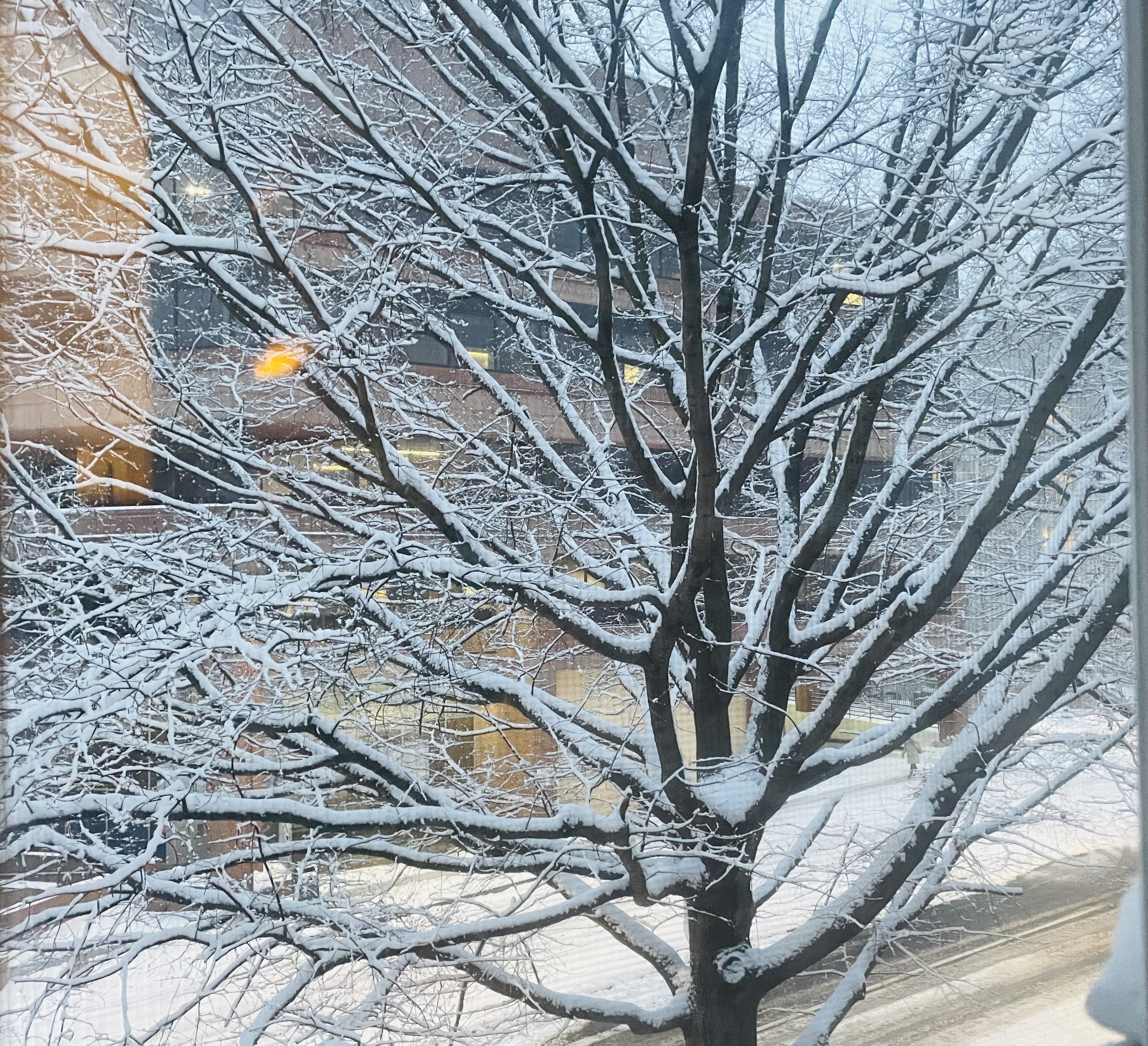 The windows bring their own delights: views of snow-covered trees as on a recent January day and the sounds of birds and squirrels in the other three seasons that make up our annual cycle of life.