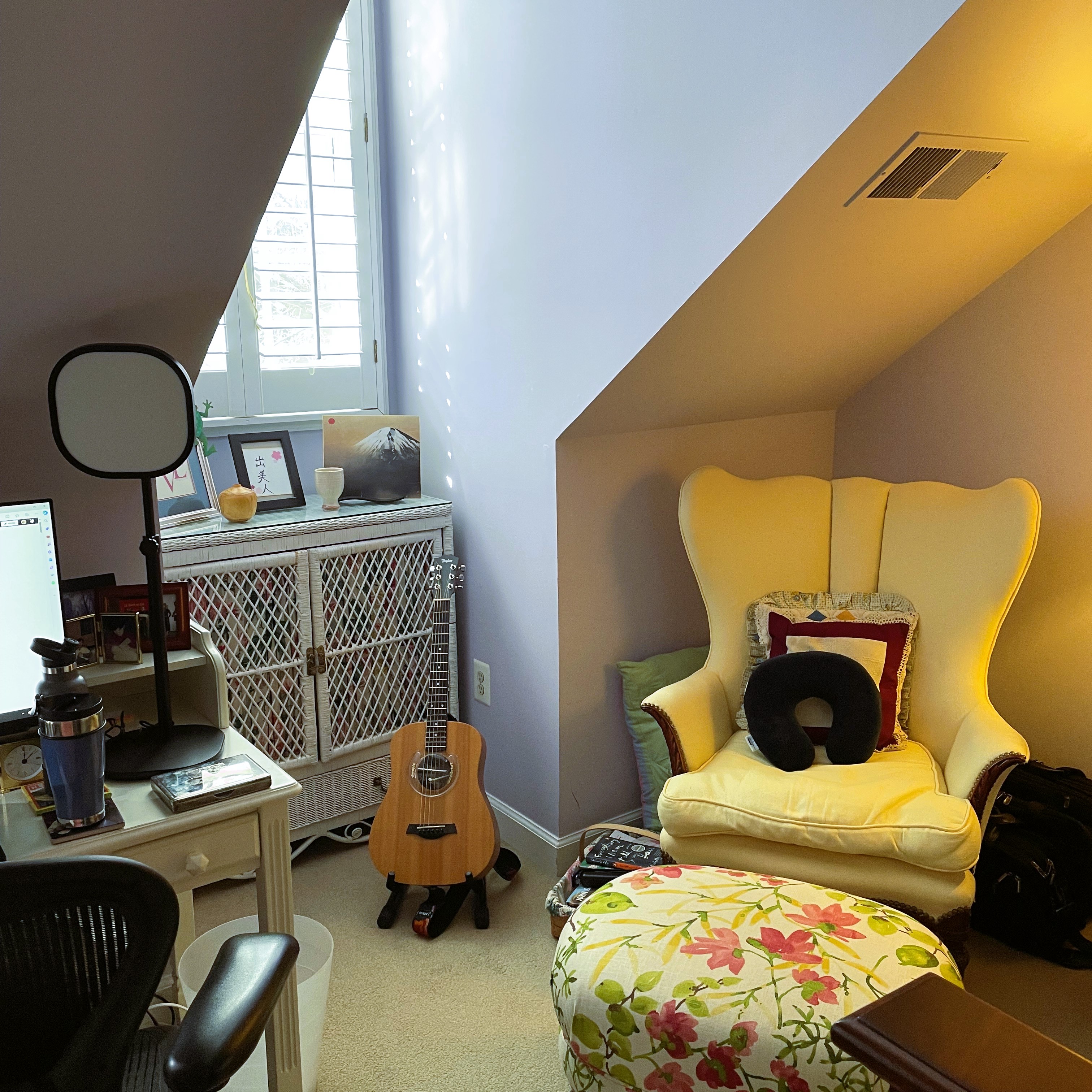 On the other side sits a comfortable chair and ottoman for reading (and because I need the rest, the ever more frequent 20-minute afternoon nap), a small guitar when I’m ready for a break, and remembrances from travels.