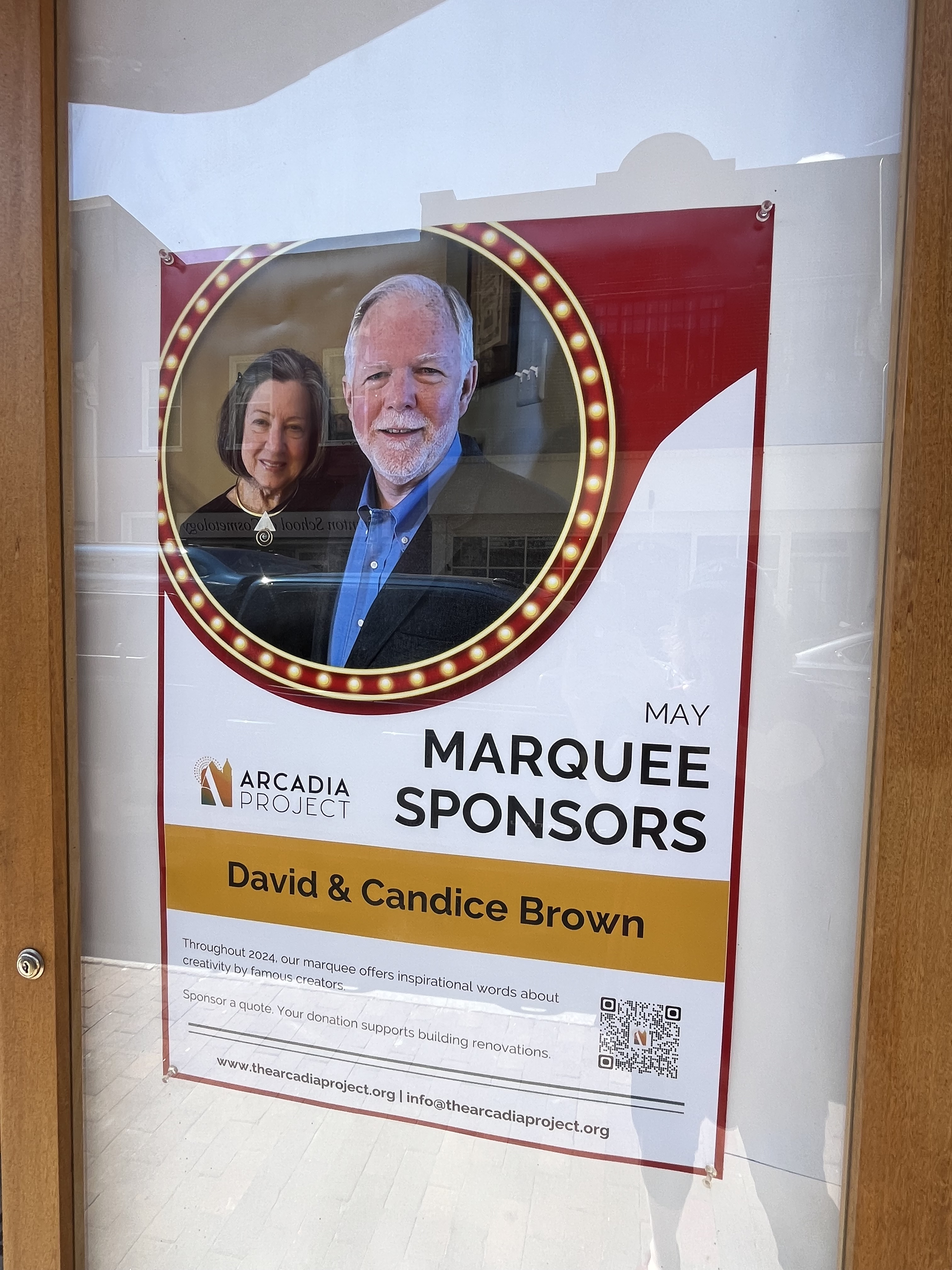 One of their innovative fundraising efforts is the Sponsor a Marquee Quote at the theatre. Sponsors can honor a business, birthday, anniversary, or loved one by giving the gift of inspiration: a quote from a famous creator. The selected quote appears on the marquee for one month and the sponsors are recognized in the sidewalk display case.