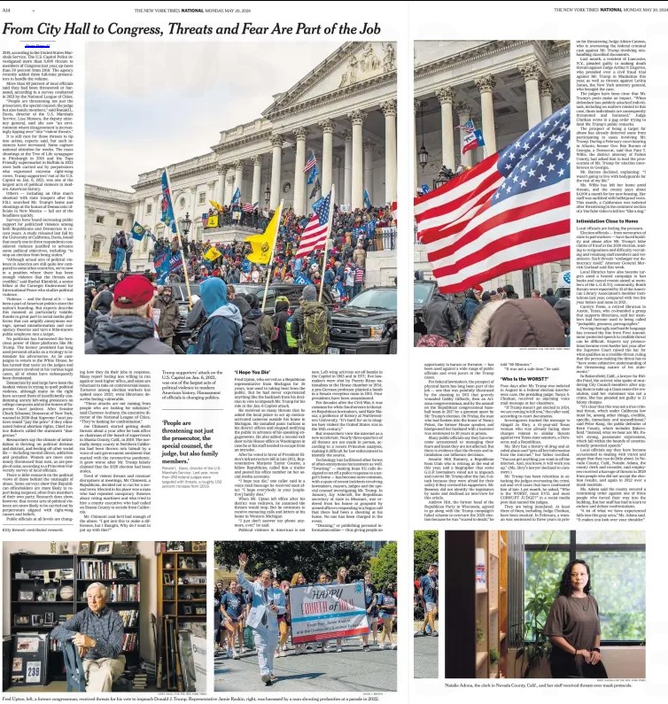When the photo was not used in the May 19th online edition, I suspected I had been left on the proverbial cutting room floor. However, when our Monday Times was delivered to the house, I saw that the story—“Threats and Fear Are Transforming U.S. Politics”—was front page.