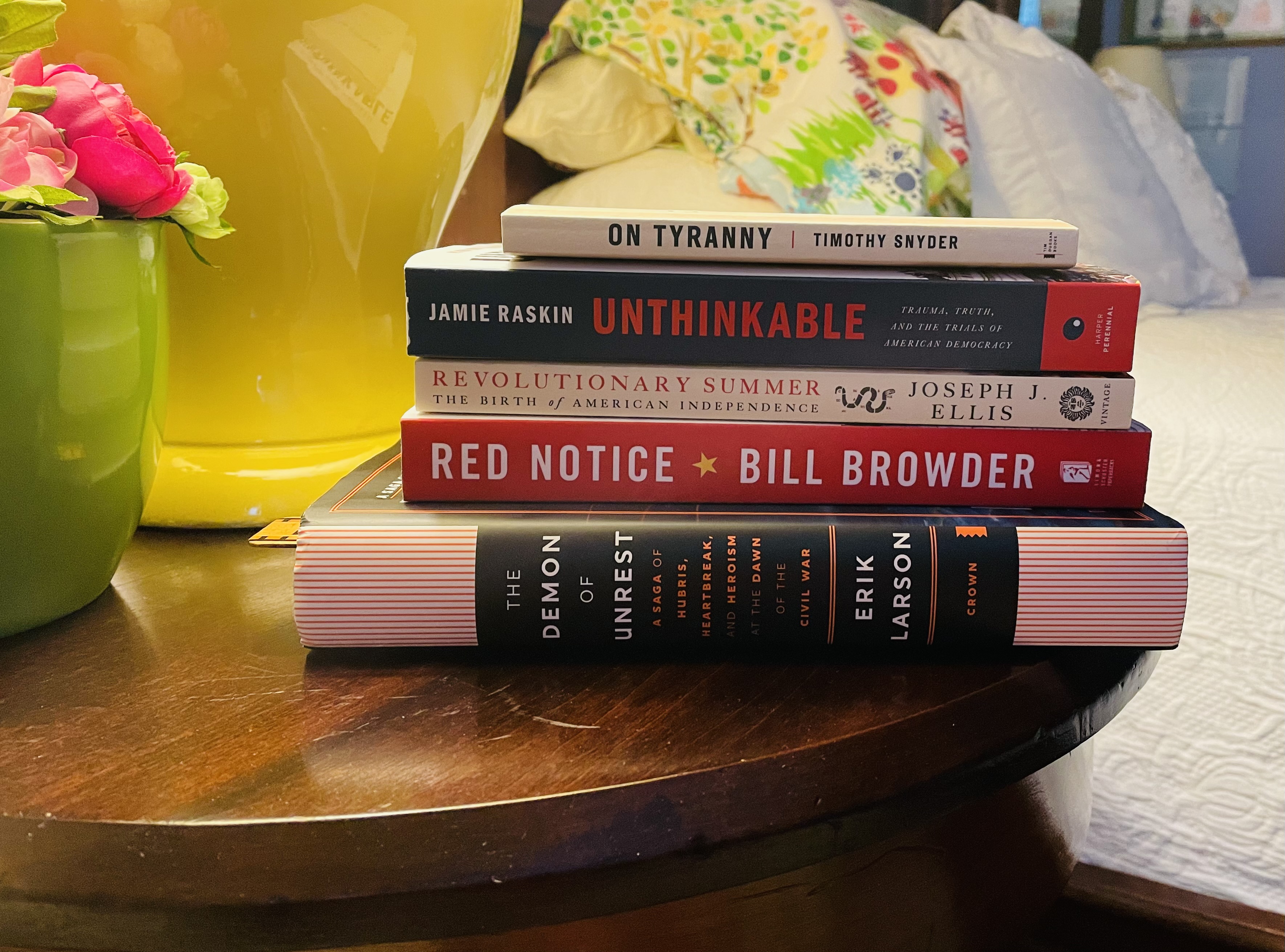 In July, I have decided to focus on five books pertinent to issues facing us today. These writers explore previous points in our history—especially the months and years just before the American Revolution and the Civil War—that will help me place today’s events in context. Two others address the murderous heart of Putin’s regime and an attempted insurrection in our country by one of Putin’s admirers. Finally, I’m returning to a book on lessons we can learn from the twentieth century about the fight against tyranny.