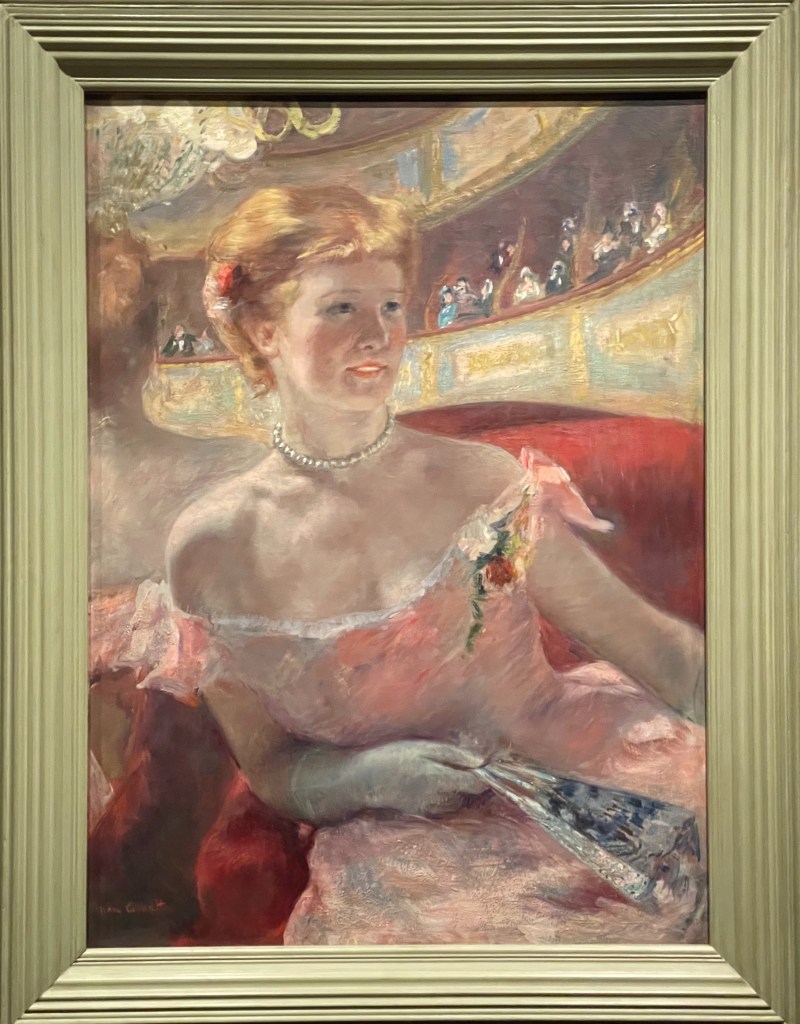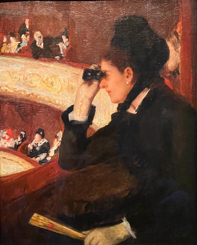 The exhibition presents “new findings about the materials she used and her processes—which were advanced for her era—as it coincides with a detailed technical study of the Philadelphia Museum of Art’s significant Cassatt holdings.” Early in the exhibition, one comes upon two paintings of ladies at the theatre, where Cassatt applied and then removed various paints and changed perspectives mid-work, information uncovered in the extensive study completed for this show.