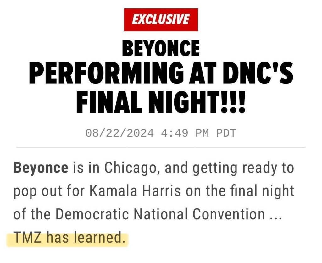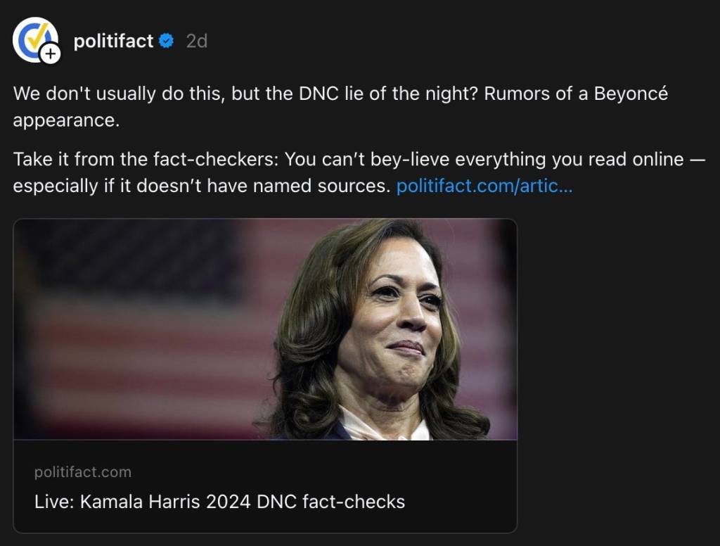 “Politifact is mad at the Democrats because Beyoncé never made an appearance at the DNC . . . however: the Dems never said Beyoncé was going to be a surprise performer. The whole thing was a complete fiction promulgated by—you guessed it—the press.“