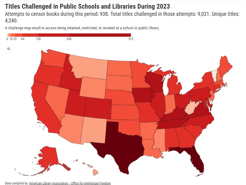 “Groups and individuals demanding the censorship of multiple titles, often dozens or hundreds at a time, drove this surge in 2023. Attempts to censor more than 100 titles occurred in 17 states: Colorado, Connecticut, Florida, Idaho, Illinois, Iowa, Kentucky, Maryland, Missouri, North Carolina, Ohio, Pennsylvania, Tennessee, Texas, Utah, Virginia, and Wisconsin.”