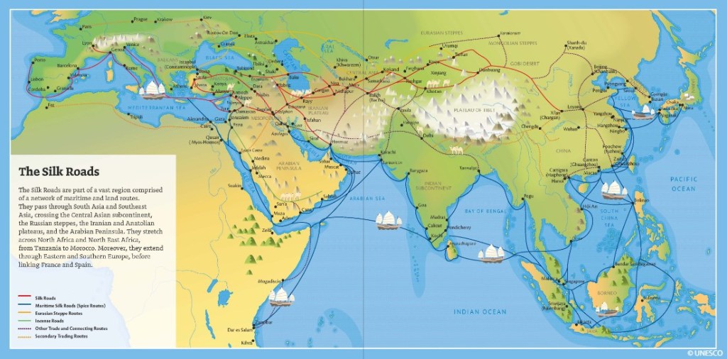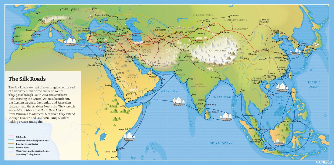 We’ve all heard about the vast trade networks of the Silk Roads. The constant movement and mixing of populations brought about the widespread transmission of knowledge, ideas, cultures and beliefs in addition to carrying merchandise and precious commodities.