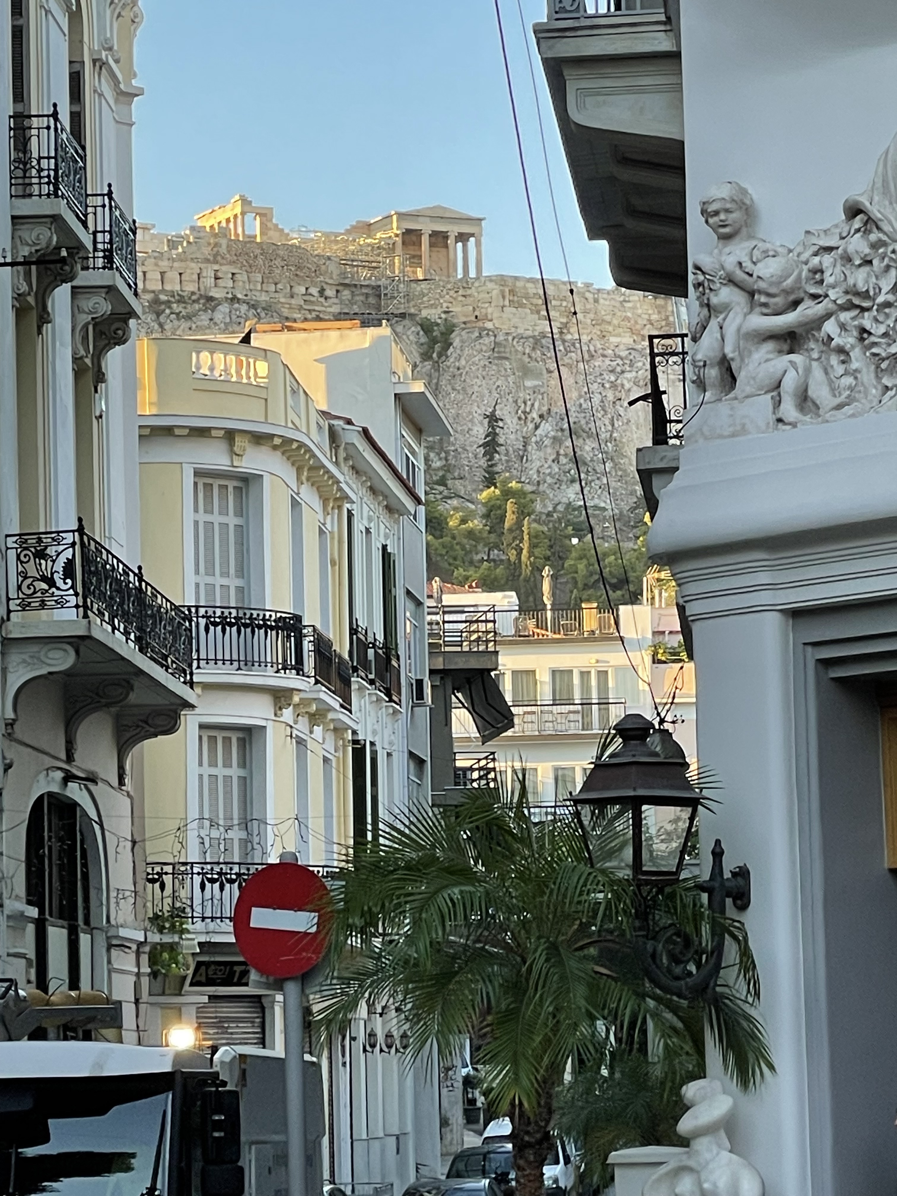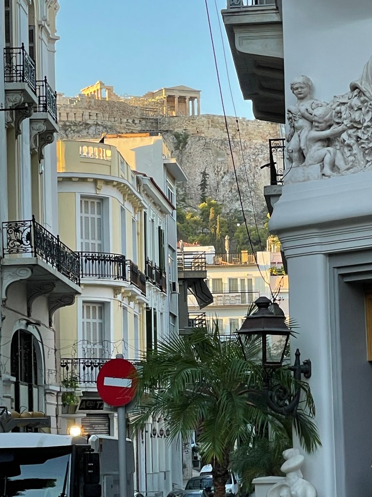 Exploring the Plaka historic district and surrounding neighborhoods of Athens on foot, with the Acropolis in the distance