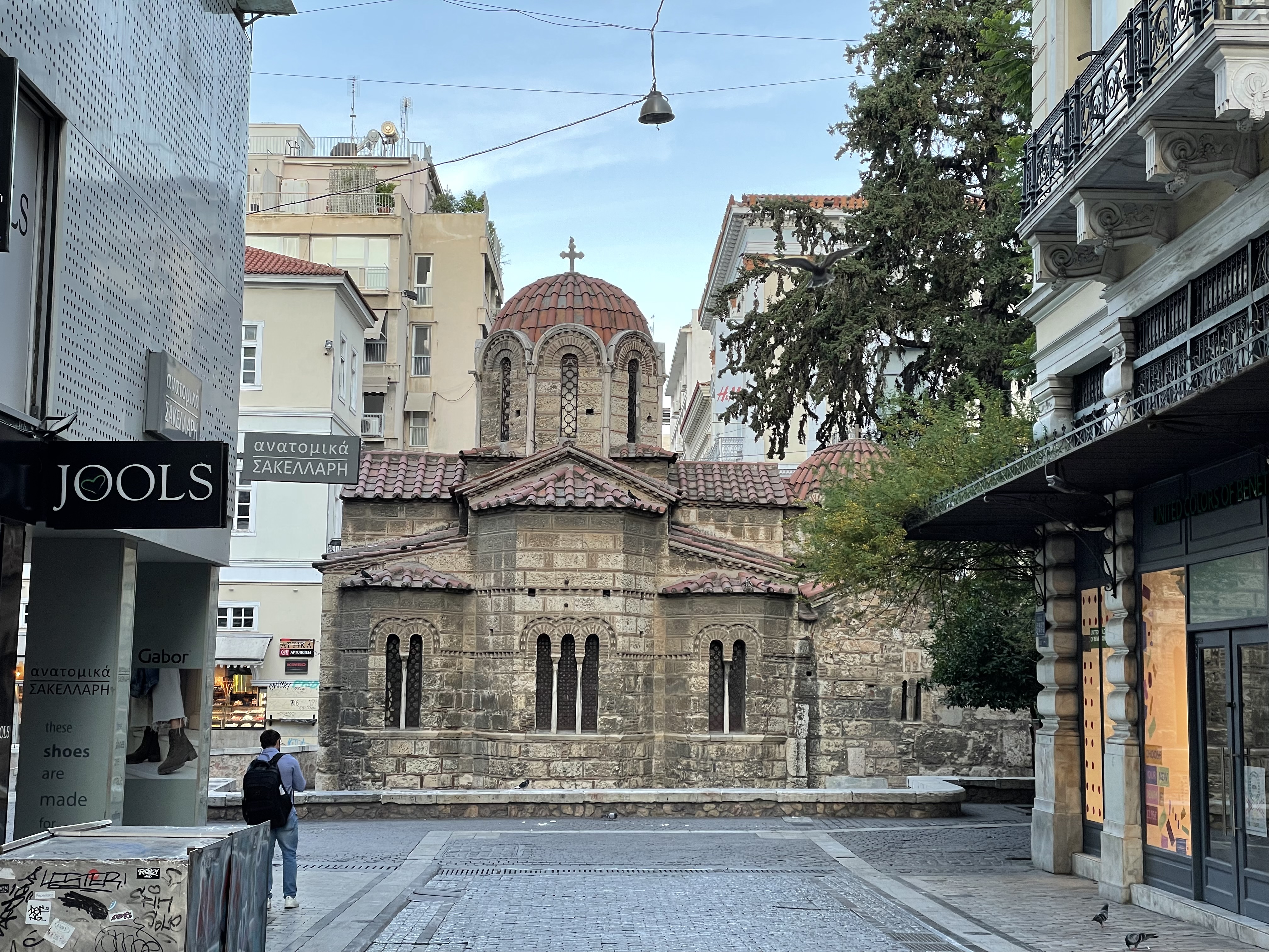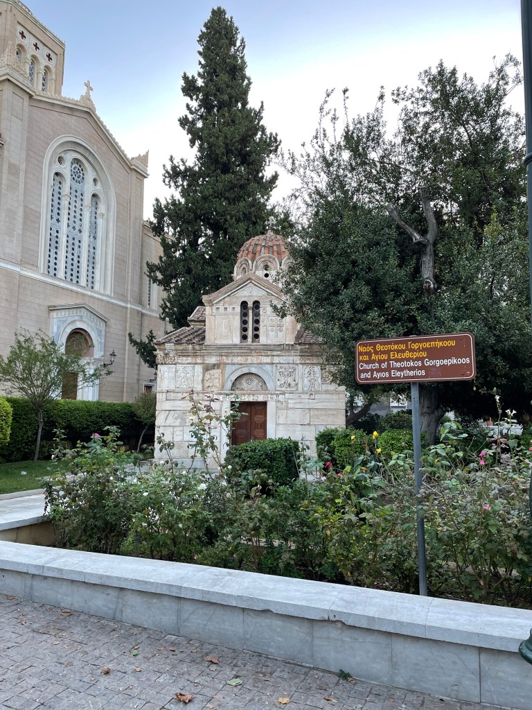 A small chapel set in the center of an intersection along Ermou Street