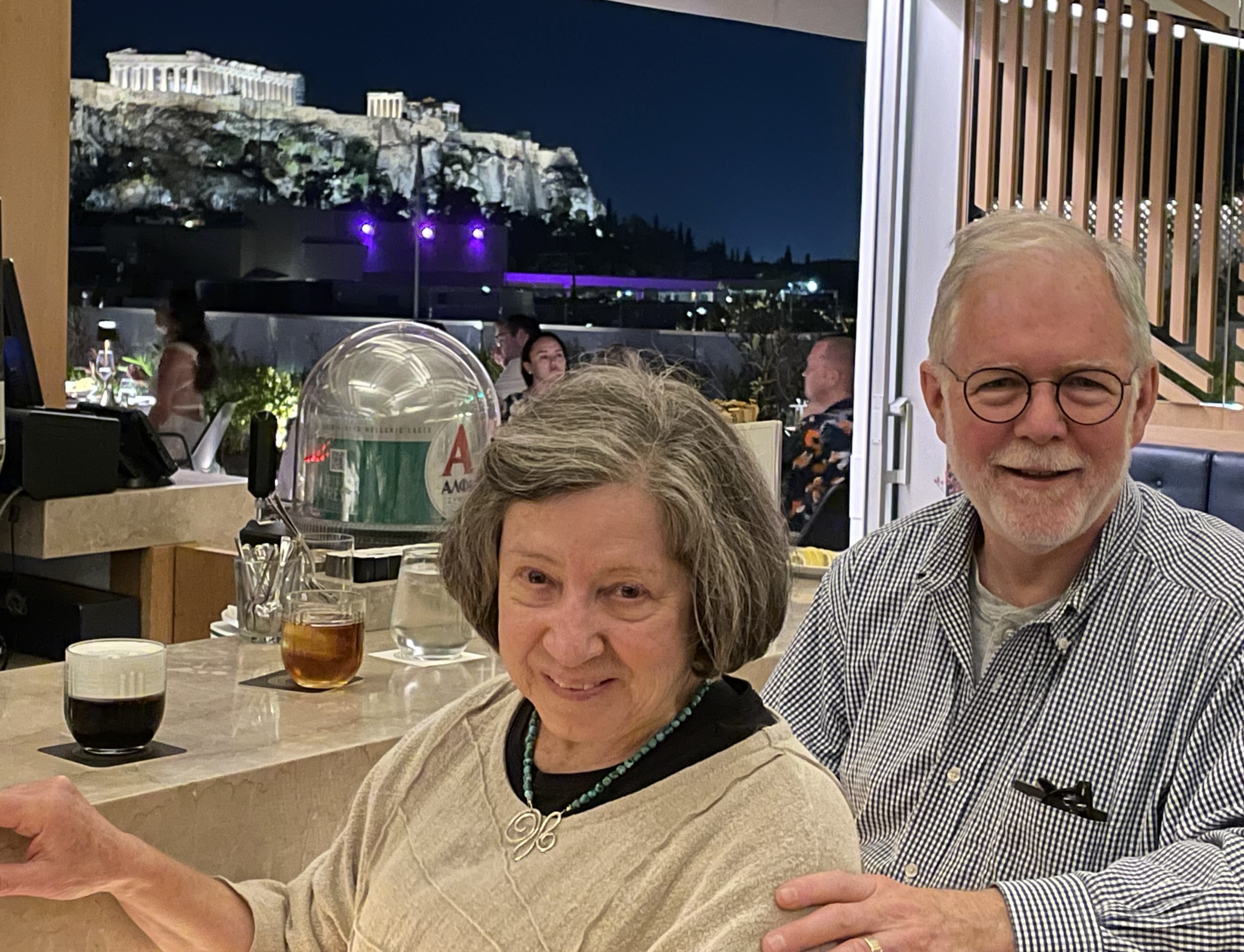 Weary travelers catching a late-night drink in the rooftop bar in our Athens hotel before catching up on the sleep lost during the flight. That backdrop is worth staying awake for.