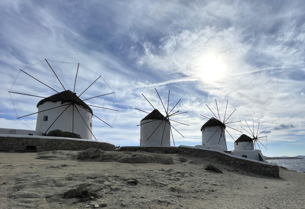 Windmills at Mykonos. Most of them were built by the Venetians in the 16th century, but their construction continued into the early 20th century. They were primarily used to mill wheat.