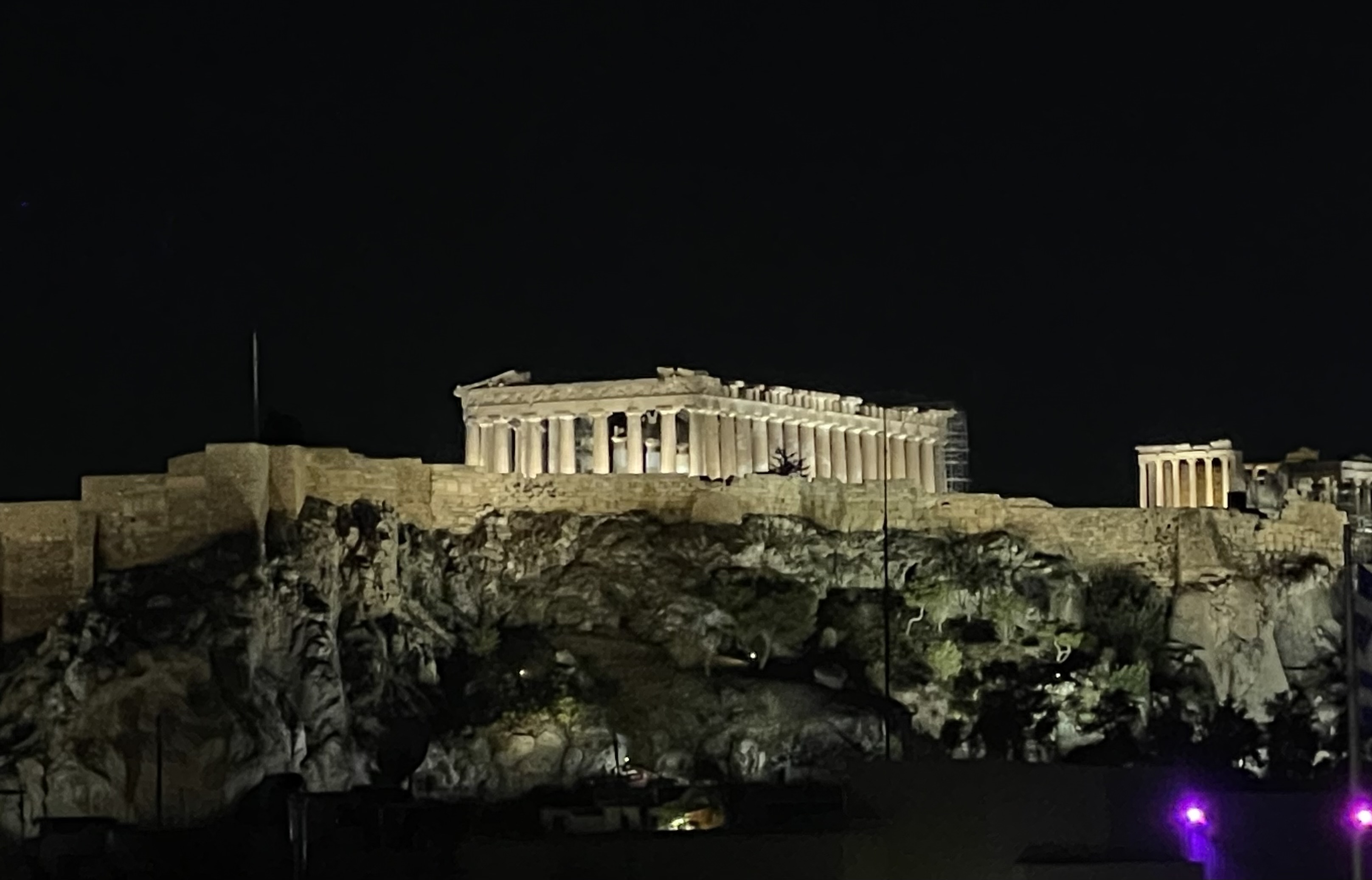 The Parthenon at night, as seen from the rooftop of our Athens hotel