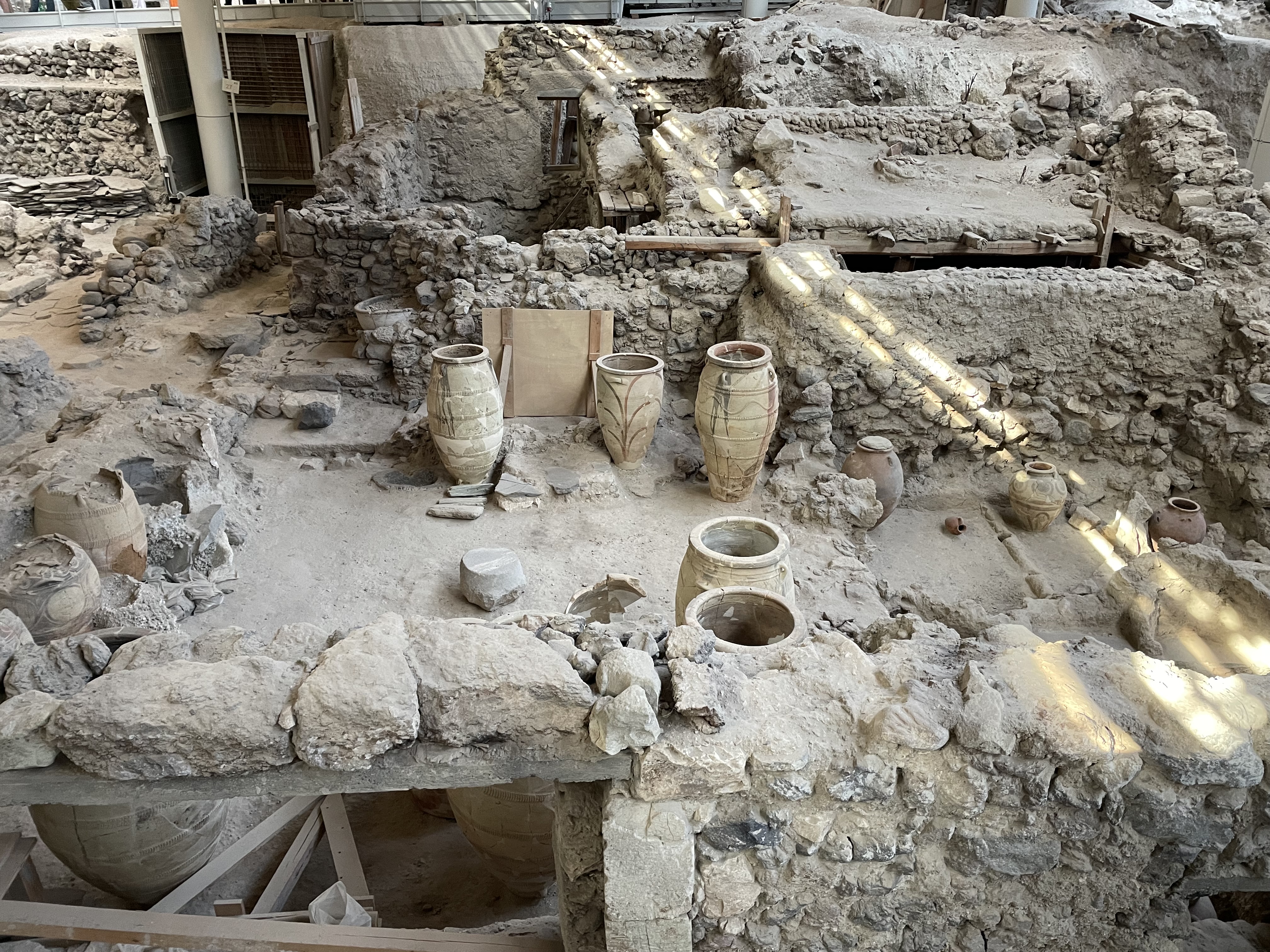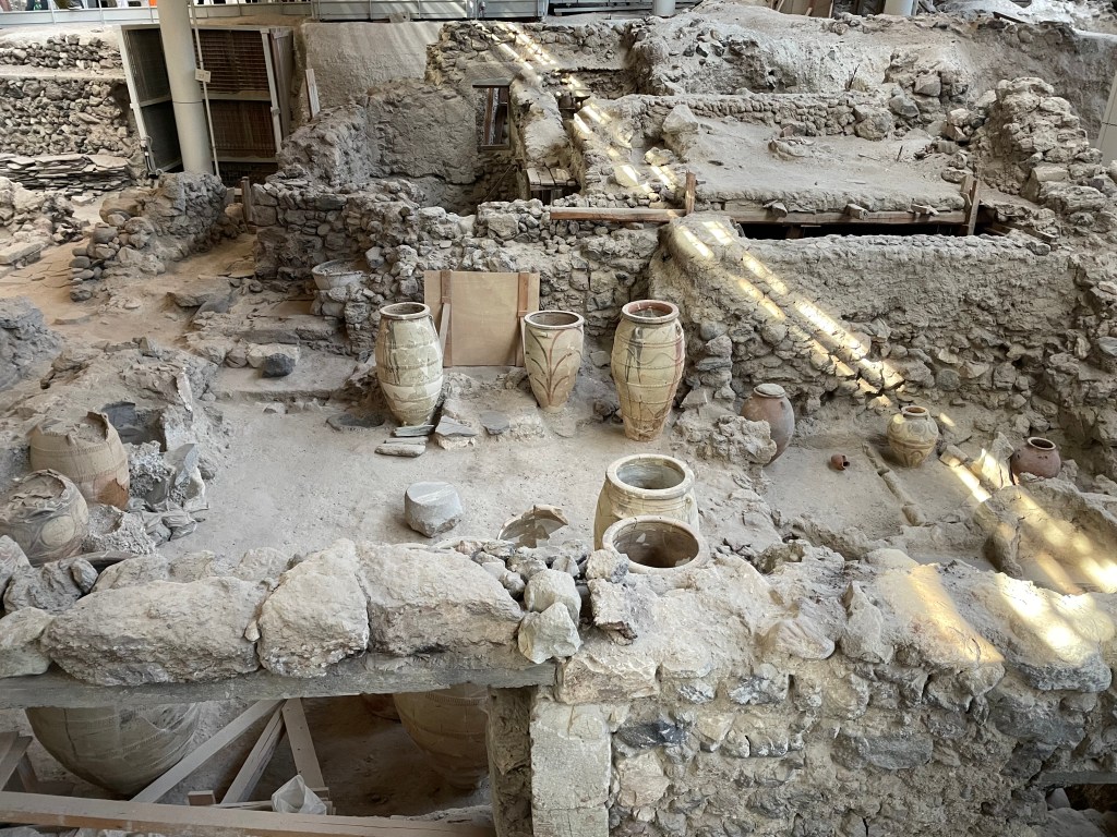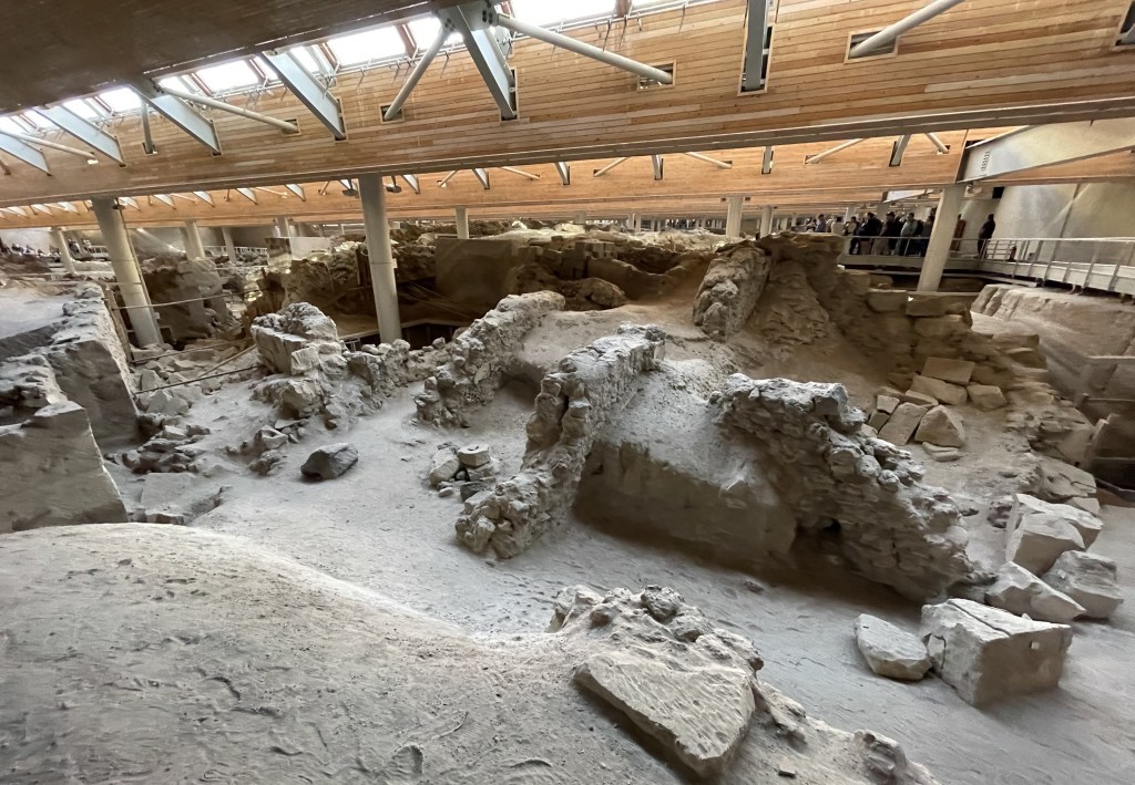 On our last day in Greece we visited the recently reopened excavations of Akrotiri on Santorini, a site that dates to prehistoric times. Like the Terrace Houses at Ephesus that I discussed in yesterday’s post, this dig was entirely under cover.