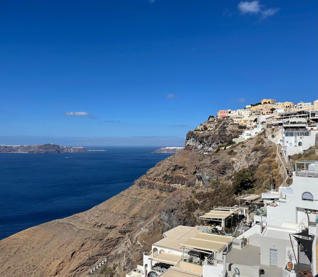 View back down to the sea from the steep cliffs of Santorini