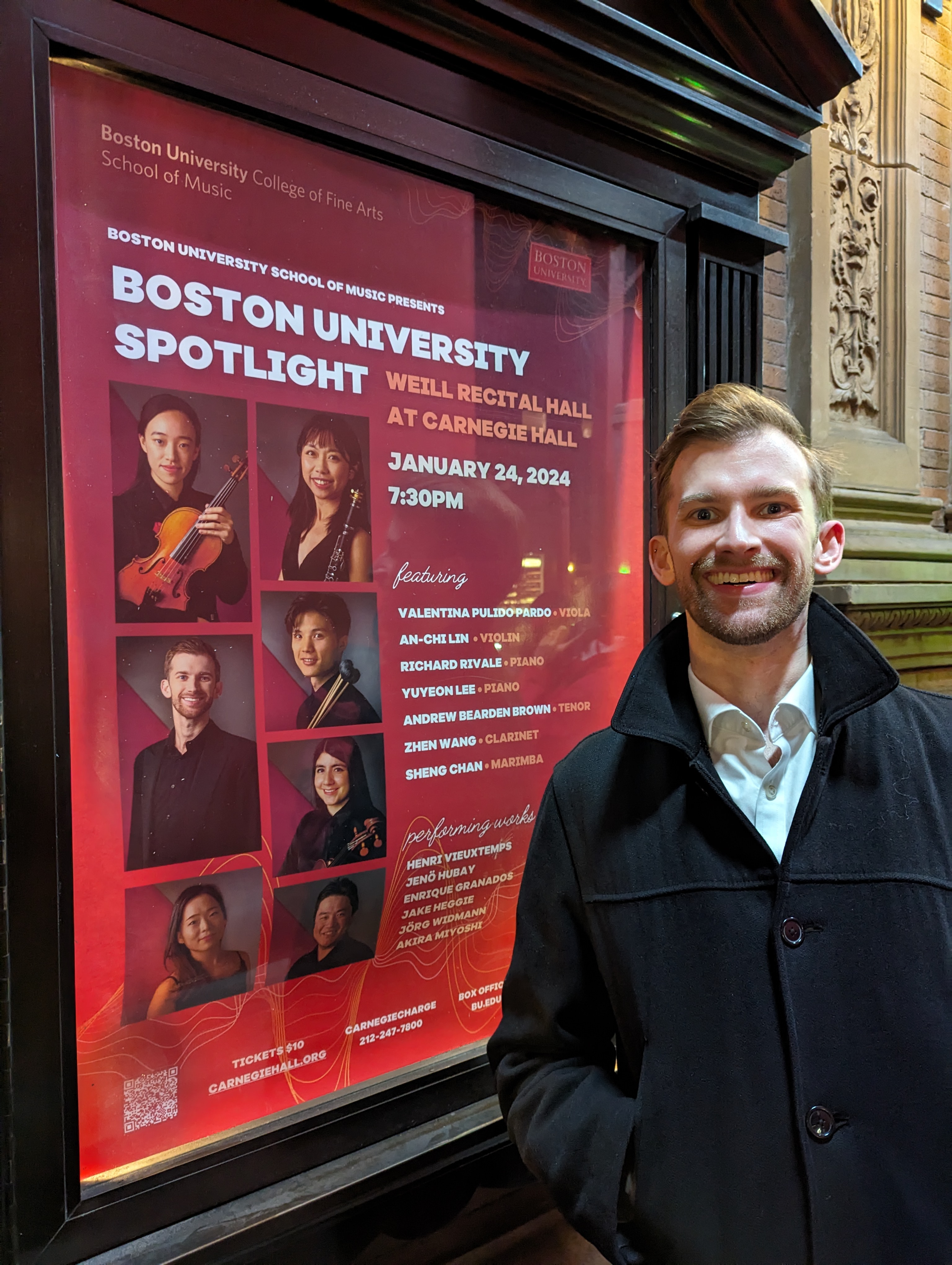 Late in January, Candice and David traveled to New York City to hear Andrew sing at Carnegie Hall as part of the Boston University School of Music Spotlight. Andrew also participated—along with fellow graduate student Valentina Pulido Pardo—in a BU College of Fine Arts video about their preparations to perform at the world-renown venue.