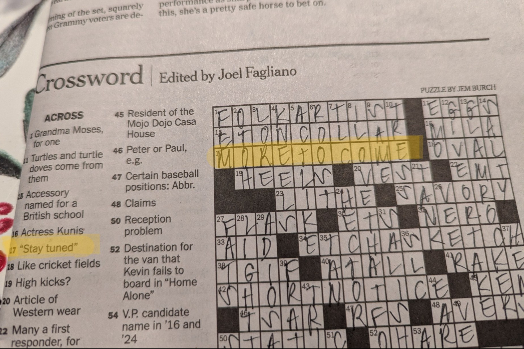One thing that pleased me came last Friday morning, when Andrew—our family puzzlemaster—called out from the dining room table, “Oh Dad, you’re going to love today’s New York Times crossword puzzle.” Sure enough, the clue to #17 Across was “Stay Tuned” which led to a family post from Andrew with the picture and note, “a common phrase for us in the NYT crossword today!”