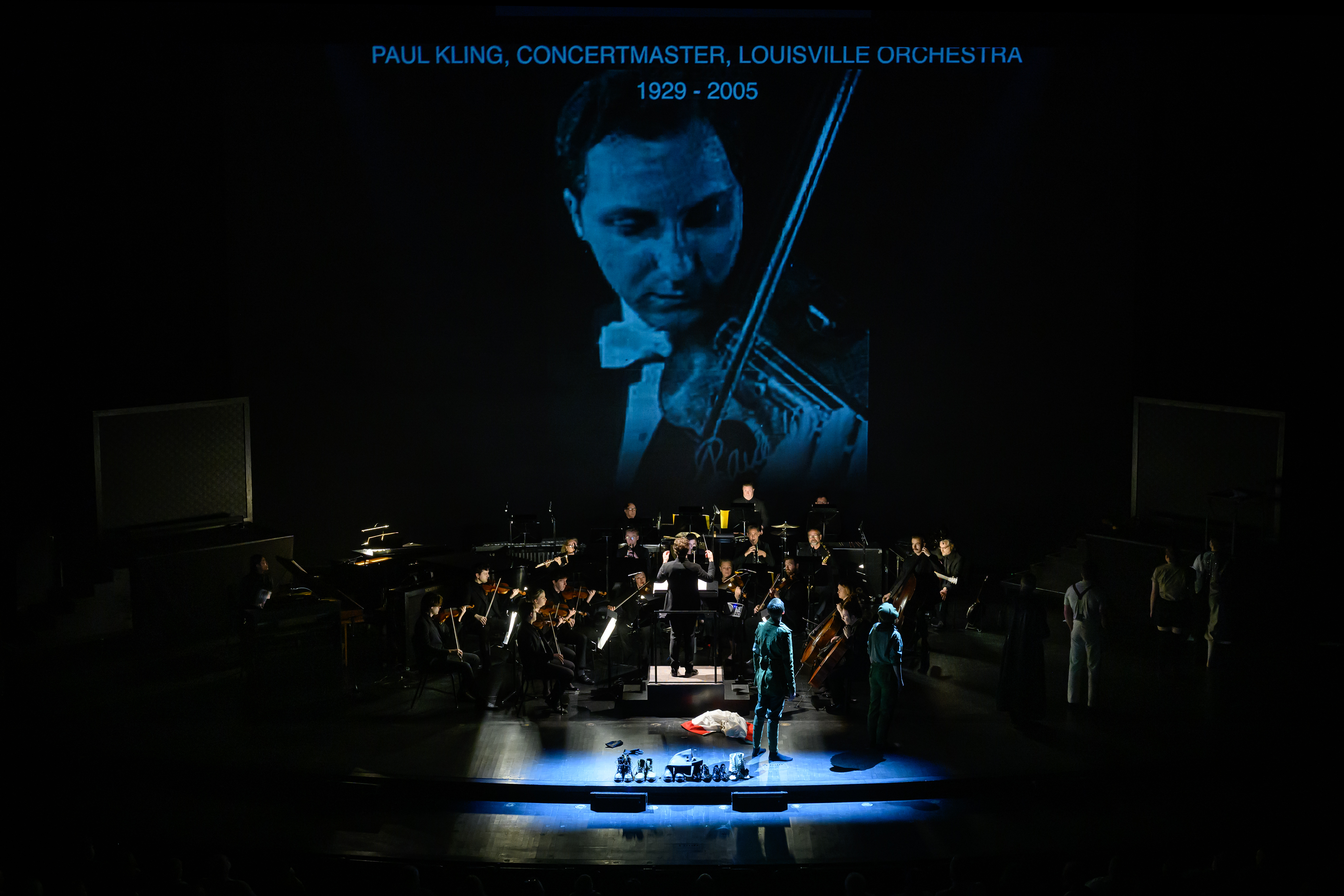 What follows is a short video featuring the orchestra’s musical director, Teddy Abrams, who discusses the career of Paul Kling, a Czechoslovakian violin prodigy who was deported to Terezin at just 14 years of age. There he participated in the rehearsals for Der Kaiser von Atlantis. Kling was transported to Auschwitz but managed to escape during a death march in early 1945, rebuilt his career, and eventually found his way to Louisville, where he was the long-time orchestra concertmaster.