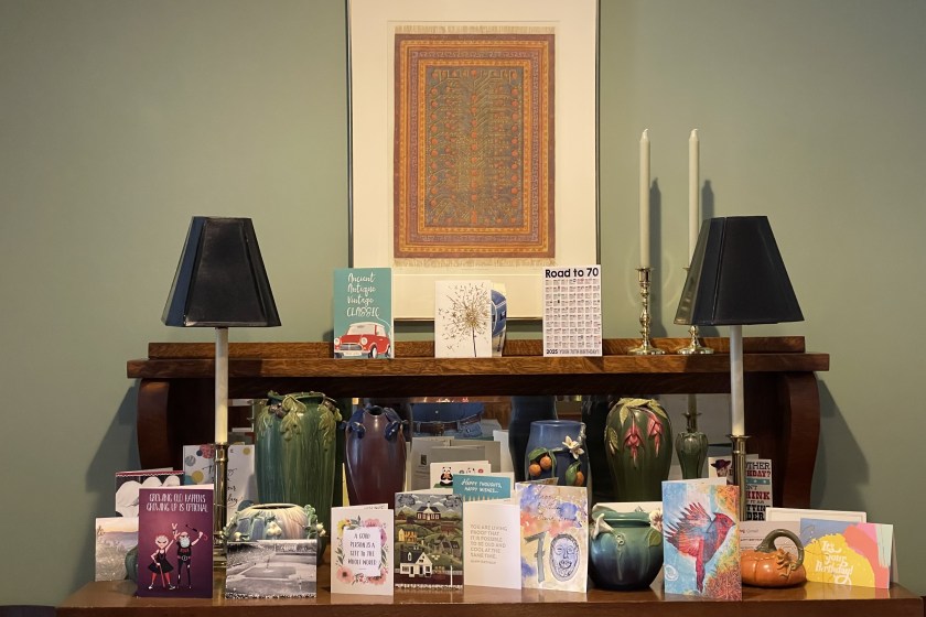 Note from a friend that reflects my feelings at the moment. This birthday card was one of several dozen received this past week after Candice asked family and friends to help in the celebration of my 70 years. There are three other tables and bookcases filled with cards around our dining room table.
