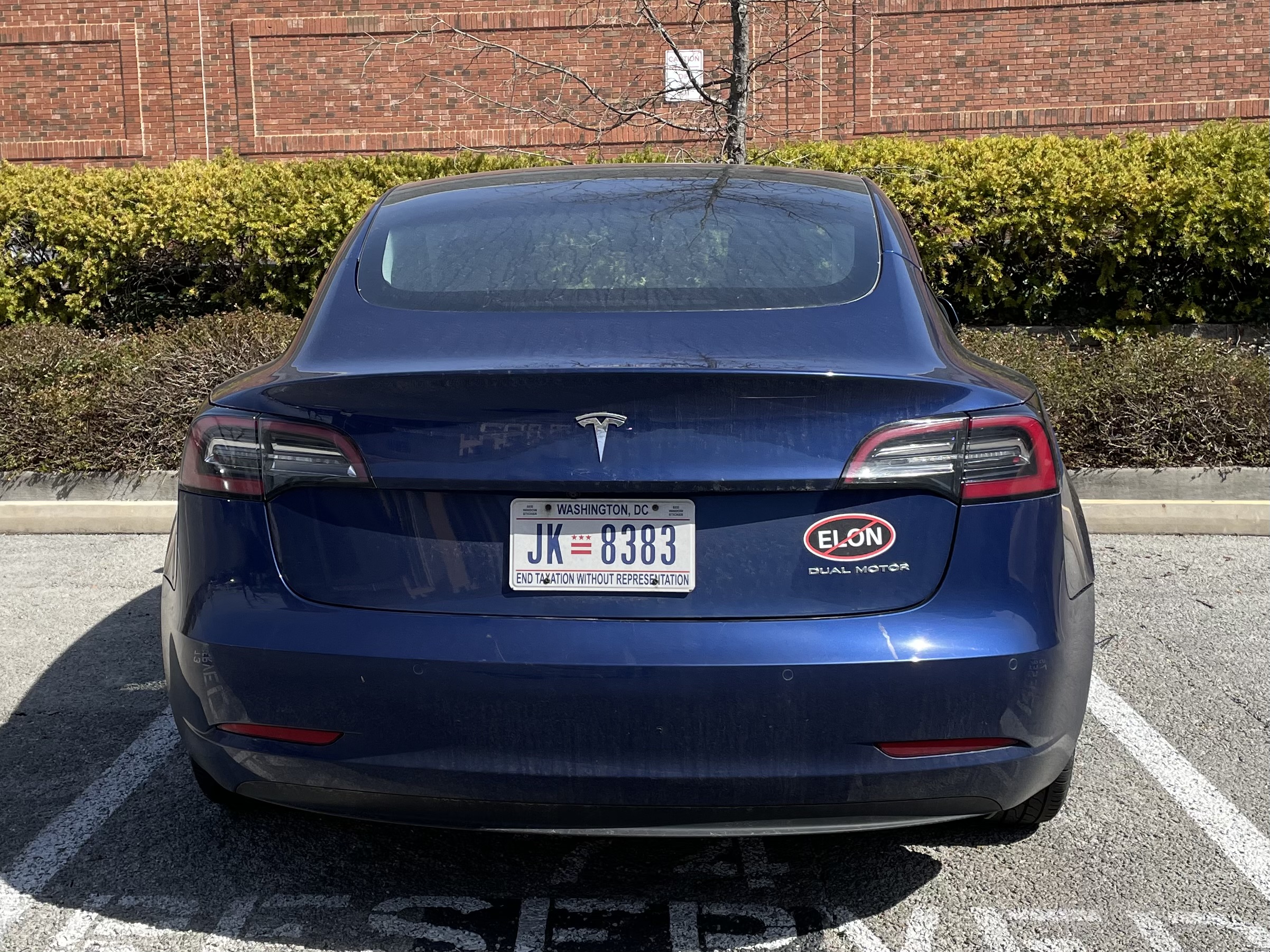 A neighbor in Takoma, DC, is letting us know that they bought the car before they knew Elon was crazy.