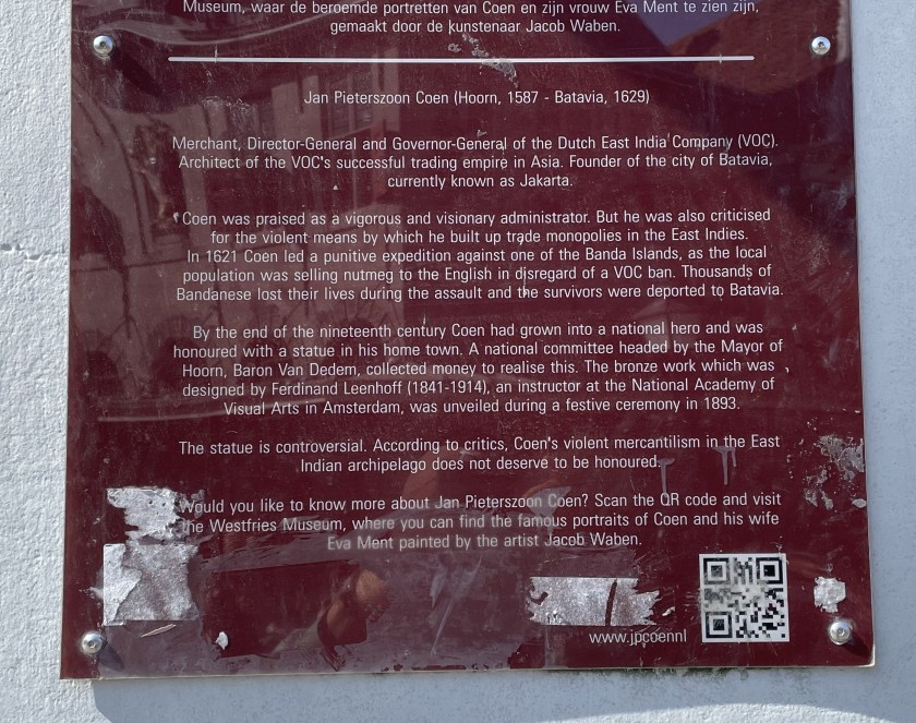 For that reason, his statue in Hoorn has been a disputed monument from the day of its unveiling in 1893. It has been smeared with red paint and graffiti numerous times in the last six decades. In 2010 a citizens’ initiative pushed for removal and in response a contextualizing plaque was added in 2012. The debate over the monument has not abated, however.