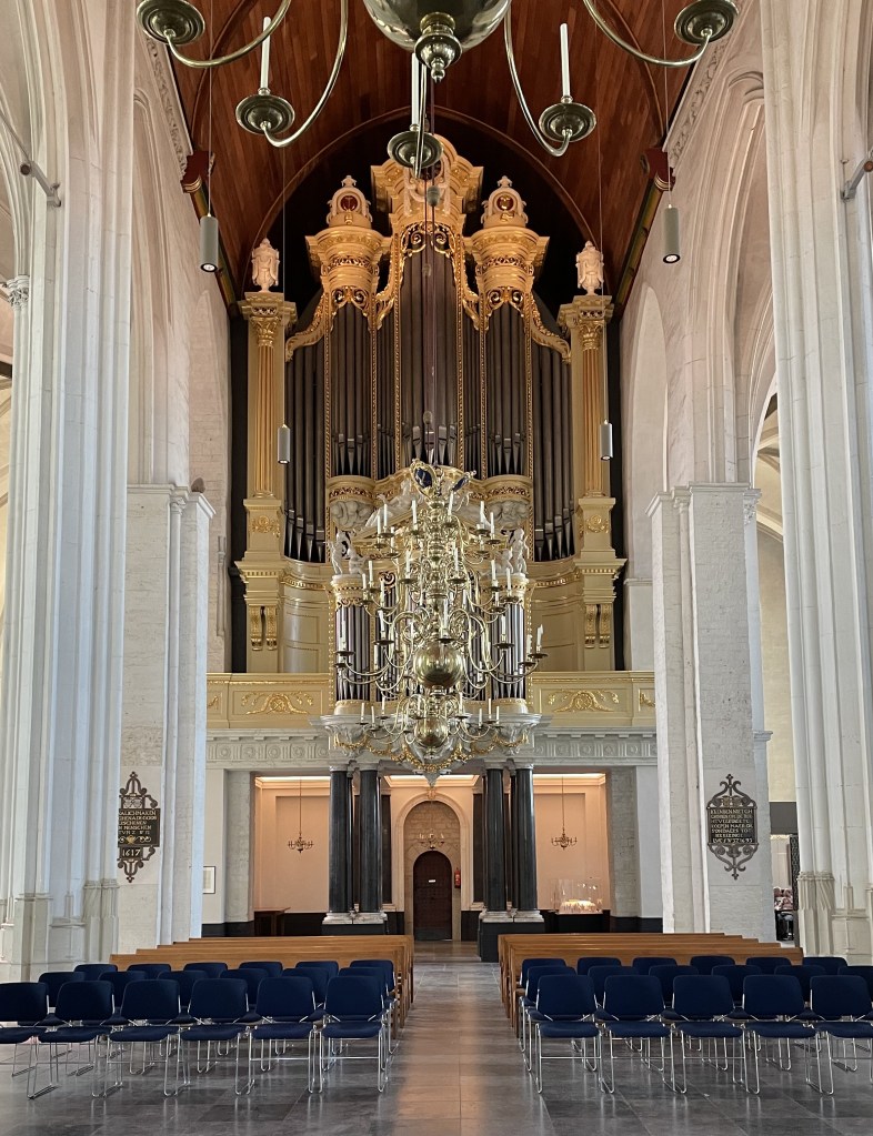 Great churches (called kerks in Dutch) are at the heart of cities in both Holland and Belgium. The next day we eagerly took in the Westerkerk, where—as is our custom—we gravitated to the organs. In 1681 the Westerkerk commissioned Roelof Barentszn Duyschot to build a new organ. He died before the instrument was complete and his son finished the job. In 1727 the console was enlarged with a third manual by Christiaan Vater. The small mechanical action choir organ was built in 1963 by the Dutch builder Flentrop.