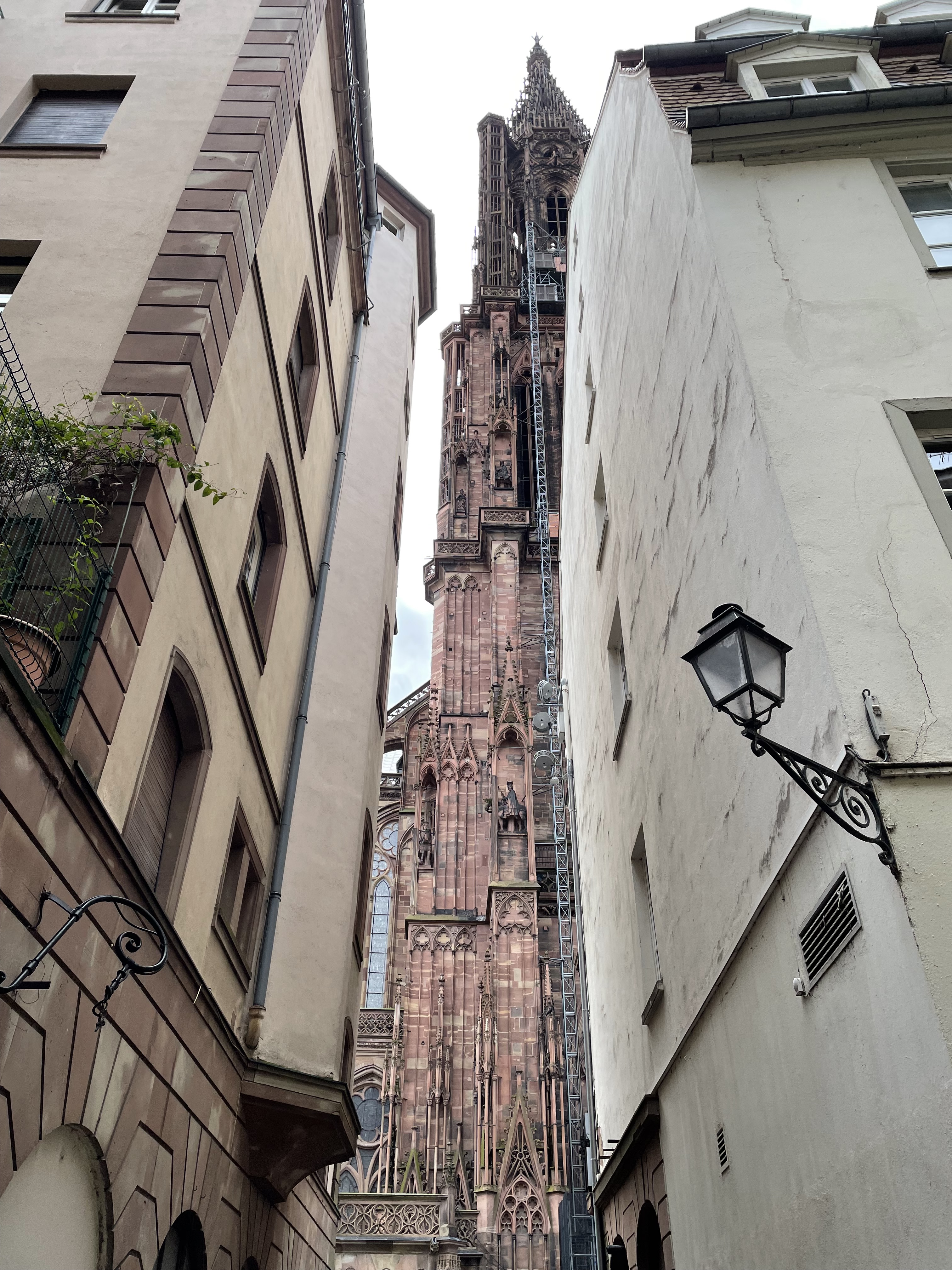 I’ve long been intrigued by the first glimpse one catches of a church, cathedral, or monastery while moving through a historic city. When seen down a narrow street as in Strasbourg, some only hint at the grandeur to come. The scale may open up more fully as one moves to a main artery. These landmarks coexist with the cityscape even as they tower over it.